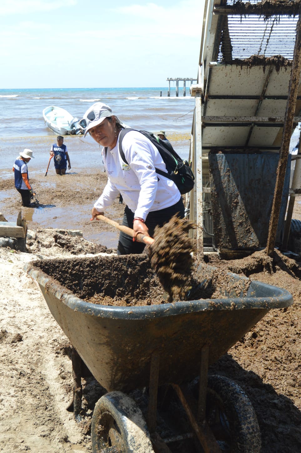 La secretaria de Medio Ambiente y Cambio Climático del municipio, Samantha Álvarez, informó que las condiciones climatológicas, particularmente la entrada de vientos del sureste, han intensificado el recale del alga marina, afectando severamente zonas como El Recodo y Punta Esmeralda, donde los equipos operan de manera ininterrumpida.