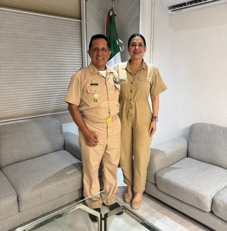 Playa del Carmen, a 13 de mayo . — La presidenta municipal de Playa del Carmen, Estefanía Mercado, sostuvo una reunión de trabajo con el Contraalmirante Cuerpo General Piloto Aviador José Alberto Rodríguez Cuevas, Comandante del Sector Naval, con el objetivo de fortalecer la coordinación en materia de seguridad y revisar los avances del trabajo que realiza la Secretaría de Marina en la limpieza del sargazo en las playas del municipio.