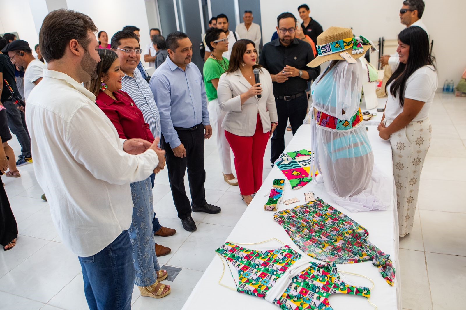 Playa del Carmen, a 4 de julio de 2025.— Con el firme compromiso de fortalecer la identidad cultural y el desarrollo económico del municipio, la secretaria de Turismo, Estefanía Hernández, y el secretario de Desarrollo y de Atracción de Inversiones, Antón Bojórquez, en representación de la presidenta municipal Estefanía Mercado, presidieron el evento de presentación oficial de productos elaborados por artesanos locales bajo la “Marca Ciudad”, en la Galería de Arte del Palacio antiguo.