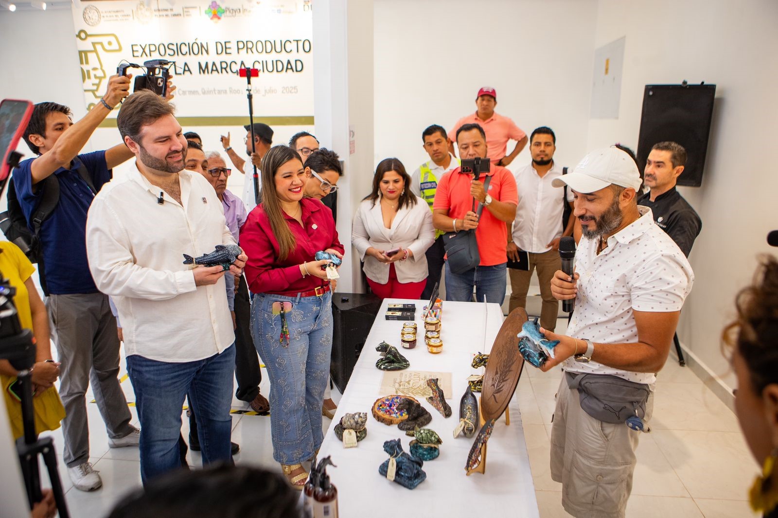 Playa del Carmen, a 4 de julio de 2025.— Con el firme compromiso de fortalecer la identidad cultural y el desarrollo económico del municipio, la secretaria de Turismo, Estefanía Hernández, y el secretario de Desarrollo y de Atracción de Inversiones, Antón Bojórquez, en representación de la presidenta municipal Estefanía Mercado, presidieron el evento de presentación oficial de productos elaborados por artesanos locales bajo la “Marca Ciudad”, en la Galería de Arte del Palacio antiguo.