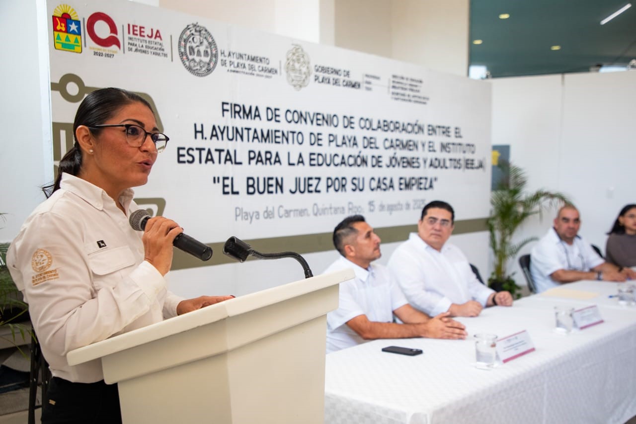 Playa del Carmen, a 15 de agosto de 2025.- El Gobierno de Playa del Carmen y el Instituto Estatal para la Educación de Jóvenes y Adultos (IEEJA) firmaron el convenio de colaboración del programa “El buen juez por su casa empieza”, con el objetivo de facilitar el acceso y la conclusión de la educación básica para las y los trabajadores del Ayuntamiento que no han finalizado sus estudios.