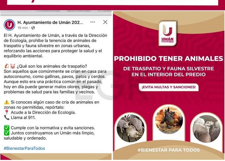 De acuerdo a un anuncio oficial, señala que el Ayuntamiento de Umán, a través de la dirección de ecología, prohíbe la tenencia de animales de traspatio y fauna silvestres en zonas urbanas, reforzando así las acciones para proteger la salud y el equilibrio ambiental.