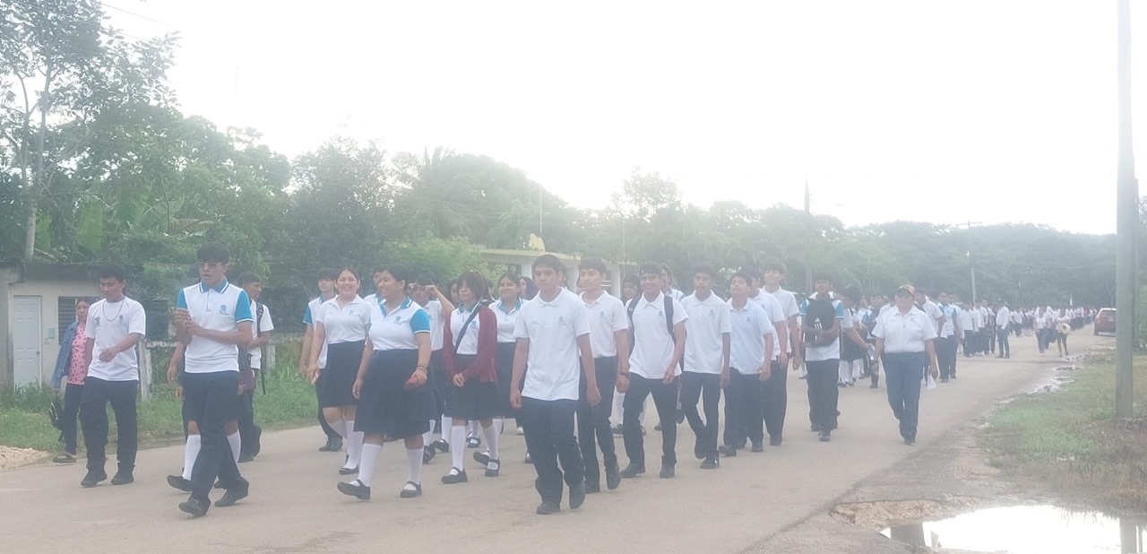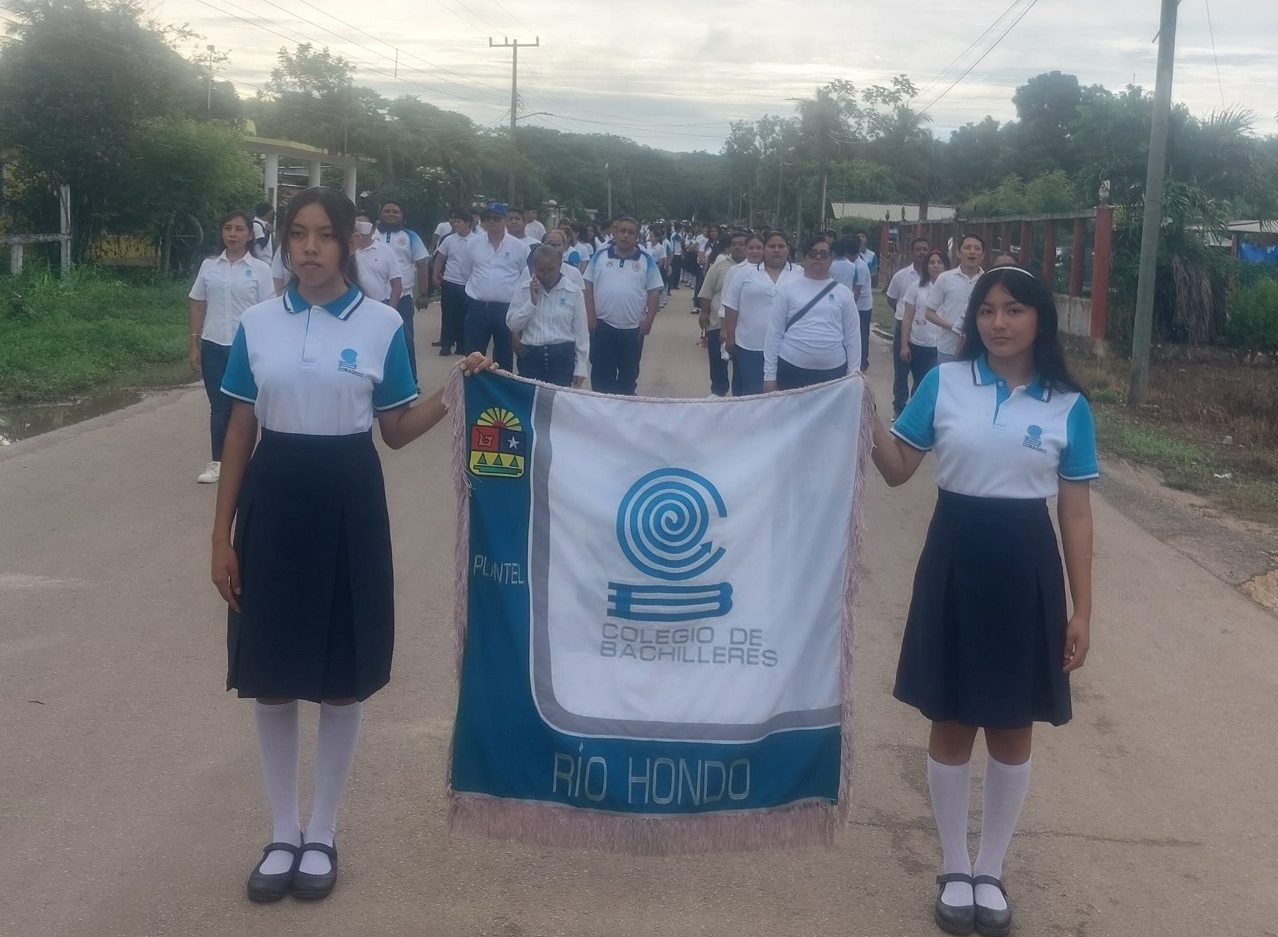 CHETUMAL, 15 de septiembre. – El Colegio de Bachilleres Plantel Río Hondo se sumó el pasado 15 de septiembre al desfile cívico conmemorativo del CCXV Aniversario de la Independencia de México, realizado en la comunidad de Pucté, Quintana Roo. Con paso firme, estudiantes, docentes y personal de apoyo marcharon para honrar a los héroes nacionales y reafirmar valores como la identidad, la unidad y el respeto hacia la nación.