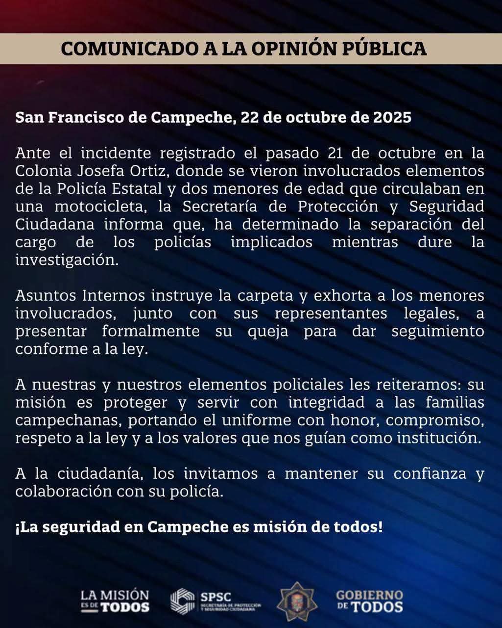 San Francisco de Campeche, Cam., 23 de octubre.- La Secretaría de Protección y Seguridad Ciudadana (SPSC) emitió un comunicado oficial reconociendo el incidente ocurrido el 21 de octubre en la colonia Josefa Ortiz, donde dos menores de edad fueron agredidos por elementos de la Policía Estatal mientras circulaban en motocicleta.