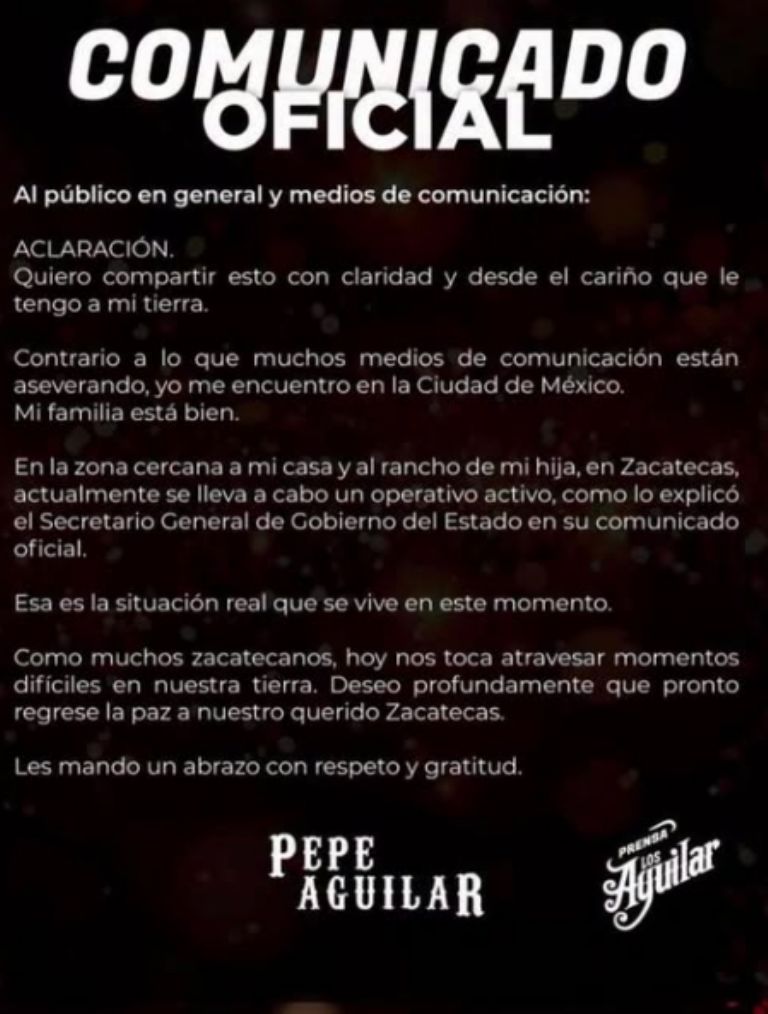 Por su parte, en sus redes sociales oficiales, Pepe Aguilar apoyó la versión de las autoridades: “Contrario a lo que muchos medios de comunicación están aseverando, yo me encuentro en la Ciudad de México”, aseguró el cantante en comunicado.
