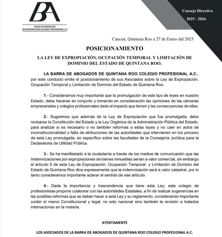 CANCÚN, 31 de enero.- Luego de varios días de realizada la aprobación y en la víspera de su cambio de directiva, la Barra de Abogados de Quintana Roo Colegio Profesional A. C. emitió el posicionamiento de sus asociados sobre la Ley de Expropiación, Ocupación Temporal y Limitación de Dominio del Estado de Quintana Roo, emitida por la XVIII Legislatura a propuesta de la gobernadora del estado.
