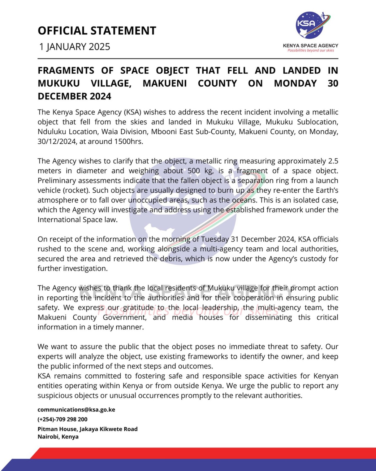 El objeto quedó esparcido entre la tierra y la vegetación, mientras varios curiosos se acercaban para observarlo. Todo era un misterio. ¿Sería parte de un avión? ¿Quizás de una nave espacial? La policía local aseguró el área hasta el arribo de un equipo de la Agencia Espacial de Kenia (KSA), que retiró los escombros para analizarlos.
