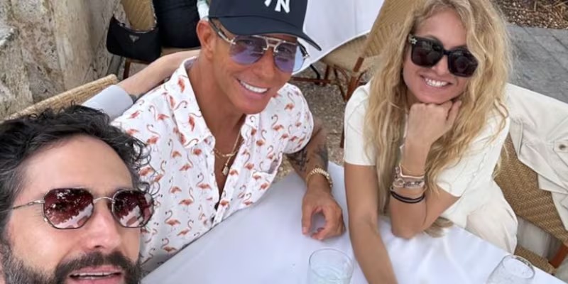 En la fotografía, los tres se dejan ver con gafas oscuras; Benny lleva una t-shirt gris, Erik una camisa estampada de manga corta con una gorra de béisbol, mientras que ‘La Chica Dorada’ luce un look en color crema.