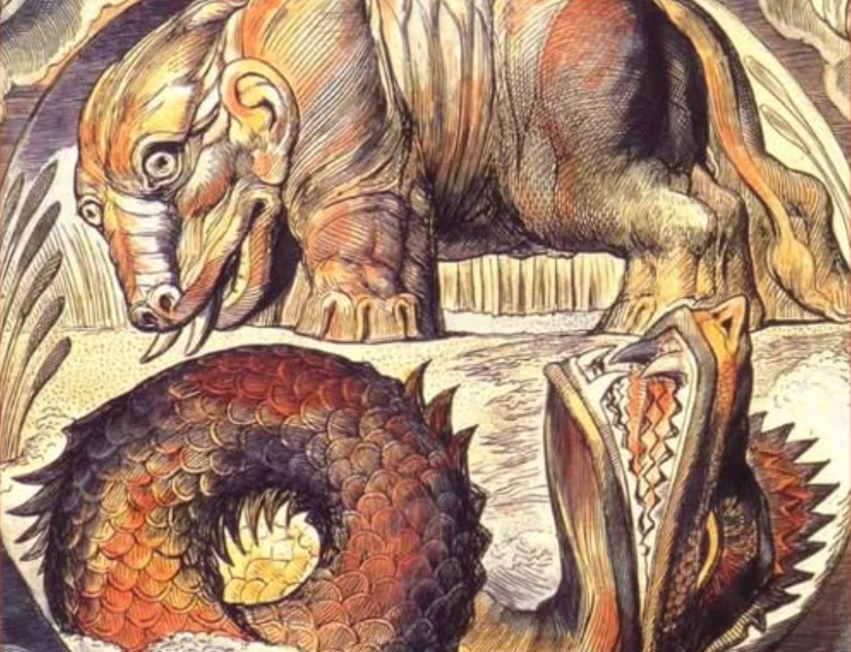 “Behemot, la primera bestia terrestre creada por Dios, se parece a un hipopótamo enorme, con una cola más grande que el tronco de un cedro y los huesos como tubo de bronce. Gobierna las criaturas terrestres como Leviatán las marinas (…) Todos los años, en el solsticio de verano, se alza sobre sus patas traseras y lanza un terrible rugido sonoro que impide que todas las bestias salvajes ataquen los rebaños y ganados del hombre durante los doce meses siguientes.”