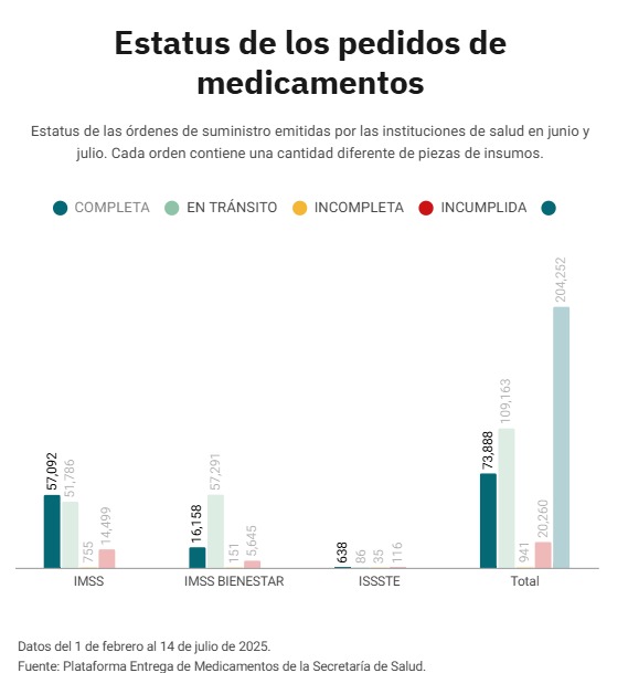 Durante ese periodo, el ISSSTE ha sido la institución con más órdenes incumplidas, seguida del IMSS e IMSS Bienestar, según los datos de la plataforma Entrega de Medicamentos.