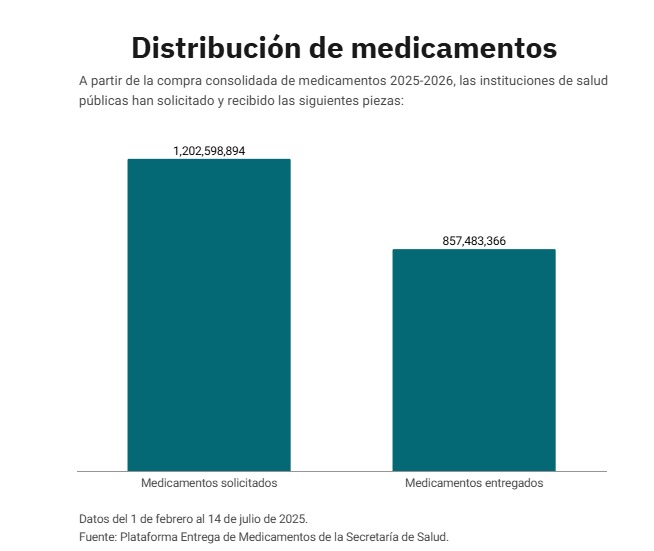 Por las fallas en la distribución, tres de cada 10 insumos de salud se han entregado con retraso en los últimos cinco meses o simplemente no han llegado a los hospitales públicos. Entre el 1 de febrero y el 14 de julio, las instituciones de salud pidieron 1,202 millones de piezas a los proveedores que ganaron contratos en la compra consolidada de medicamentos 2025-2026, pero solo se han entregado 857 millones, 71%.