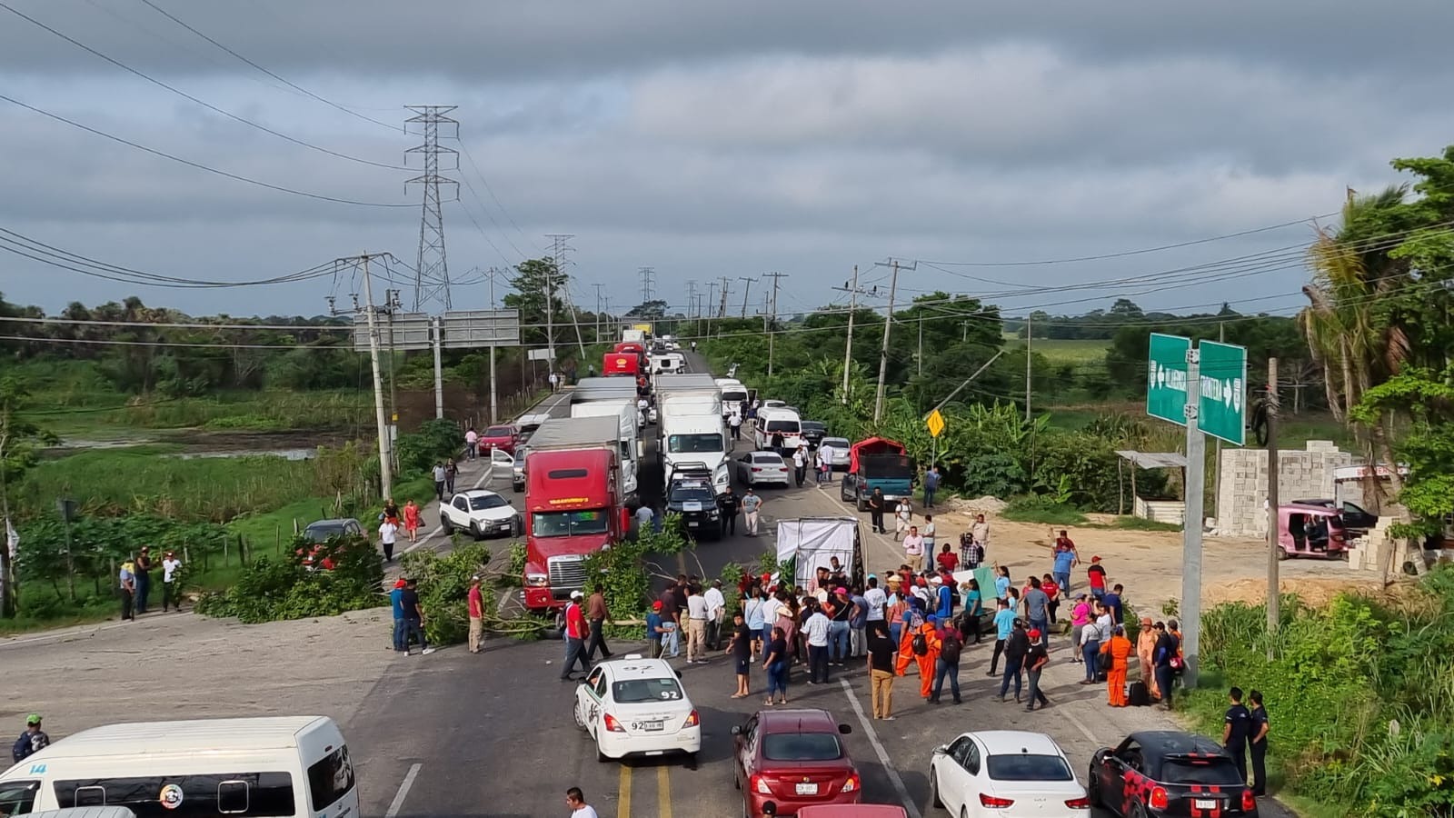La carretera Villahermosa-Frontera permanece bloqueada al tránsito vehicular por habitantes de la villa Tamulté de las Sabanas, que exigen una subestación eléctrica para ya no tener cortes en el suministro del servicio de la Comisión Federal de Electricidad (CFE).