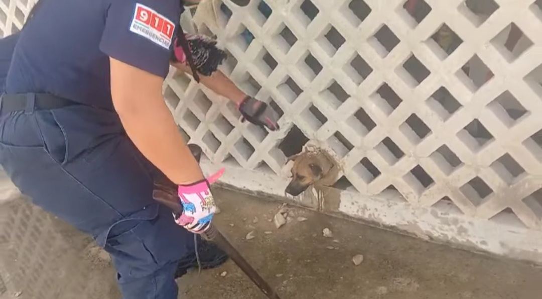 TULUM a 04 de octubre .— Elementos del Heroico Cuerpo de Bomberos de Tulum lograron rescatar a un perrito que había quedado atrapado entre las rejillas de concreto de una pared, luego de recibir un reporte ciudadano que alertó sobre la situación.