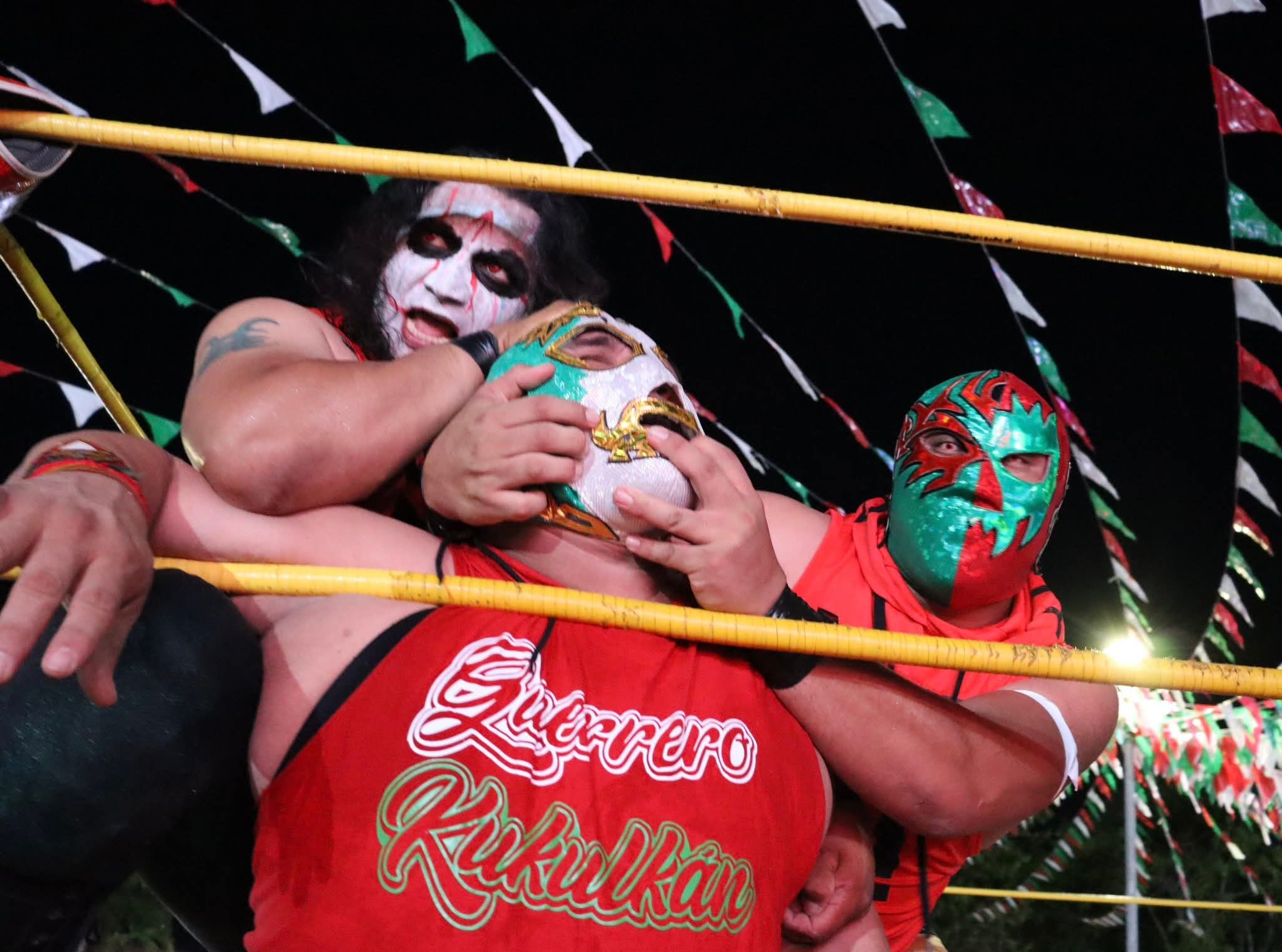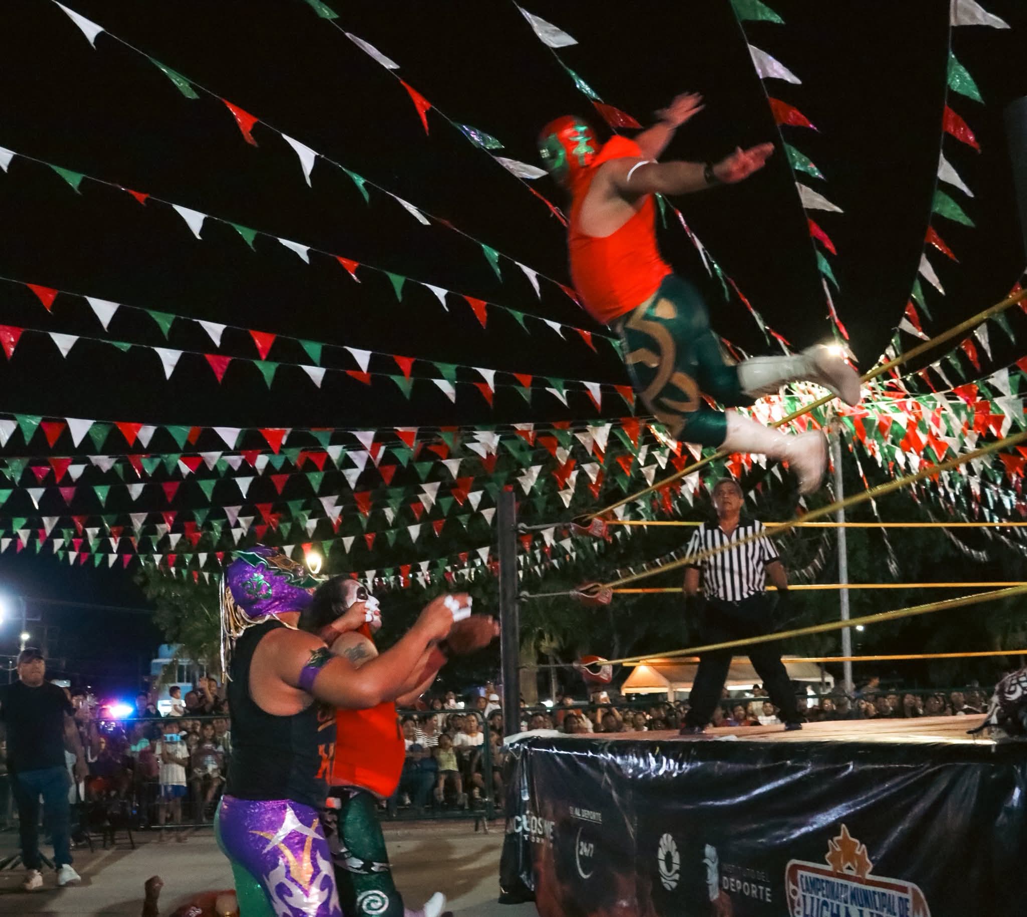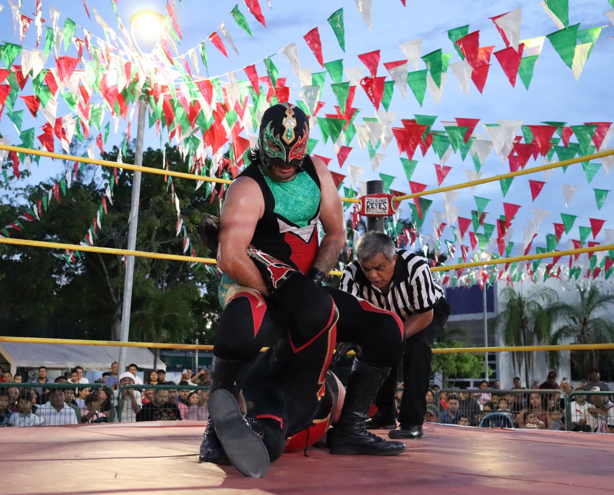 CANCÚN, Q. ROO a 7 de septiembre.- El -Mes Patrio- ya se siente en la Plaza Cívica del ejido Alfredo V. Bonfil, la cual este pasado sábado, lució una escenografía llena de papelitos tricolores, para recibir a las familias bonfileñas, mismas que disfrutaron al máximo, con la quinta eliminatoria del Campeonato Municipal de Lucha Libre, el cual es organizado por el Instituto Municipal del Deporte de Benito Juárez, con el apoyo de las distintas promotoras del -Deporte Espectáculo- en Cancún, a la par de contar con el aval de la Honorable Comisión de Boxeo, Lucha Libre y Artes Marciales Mixtas de la entidad.