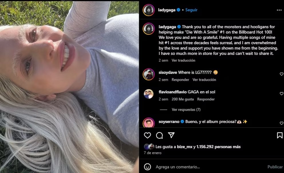 De hecho, la artista celebró este hito en su carrera musical en su cuenta de Instagram con una publicación en la que agradeció a sus fanáticos por apoyar este sencillo: “Gracias a todos los monsters y hooligans por ayudarnos a llevar ‘Die With a Smile’ al número uno en el Billboard Hot 100. Los amamos y estamos muy agradecidos”, expresó.