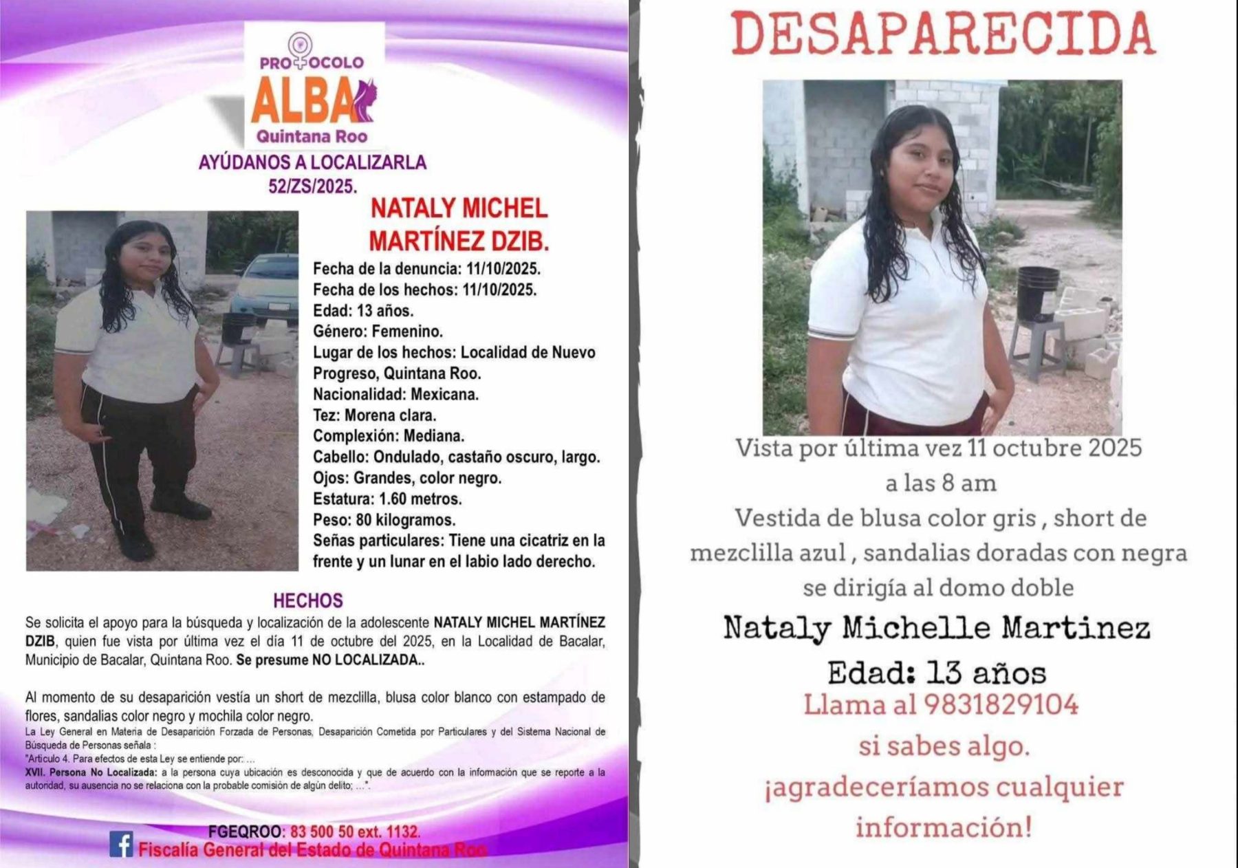 La Fiscalía activó el Protocolo Alba por la desaparición de Nataly Michel Martínez Dzib, de 13 años, vista por última vez el 11 de octubre en la comunidad de Nuevo Progreso, Bacalar