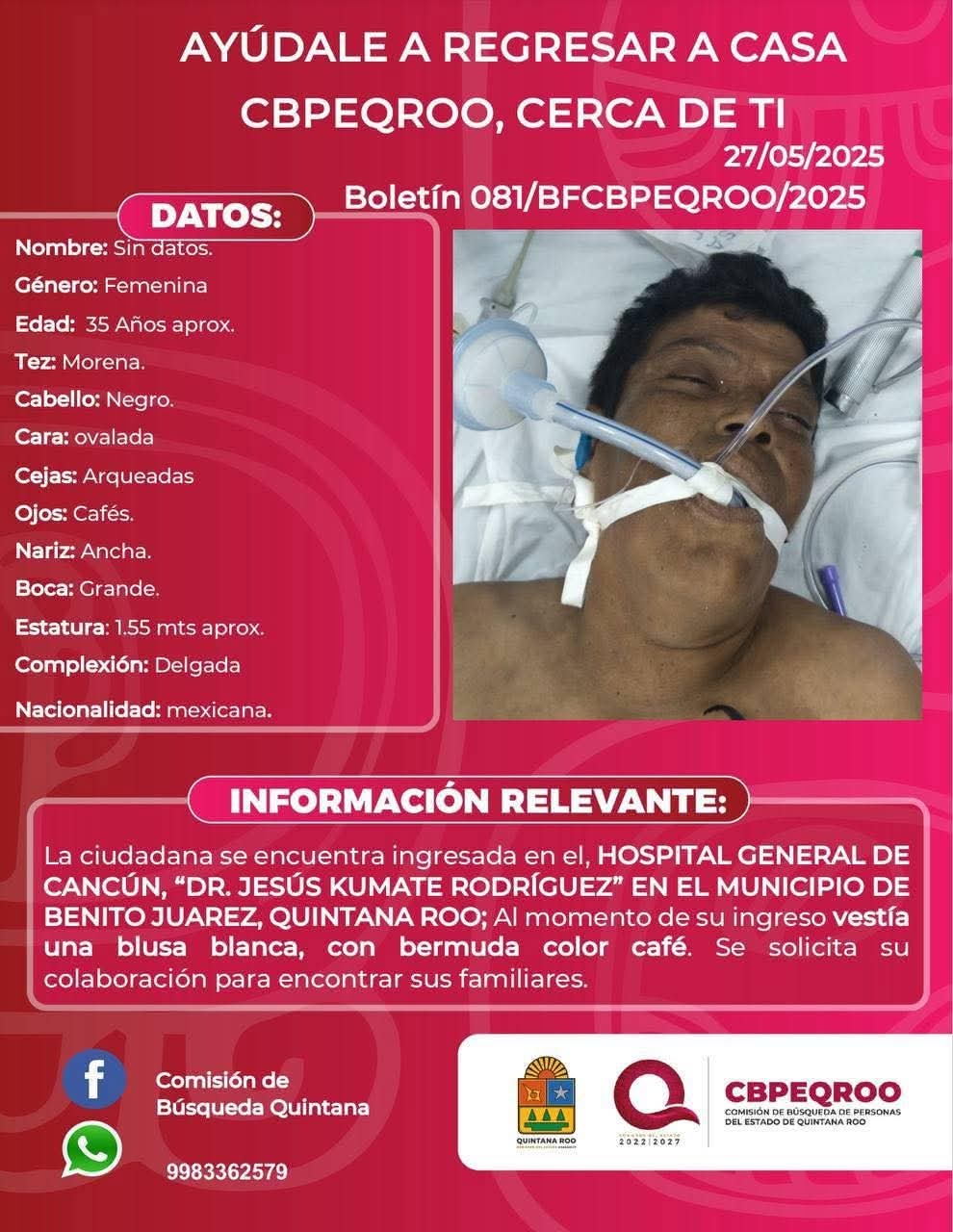 Cancún, 29 de mayo.– La Comisión de Búsqueda de Personas del Estado de Quintana Roo (CBPEQROO) lanzó un llamado urgente a la ciudadanía para localizar a los familiares de una mujer que permanece hospitalizada en estado grave en el Hospital General “Dr. Jesús Kumate Rodríguez”, en el municipio de Benito Juárez.