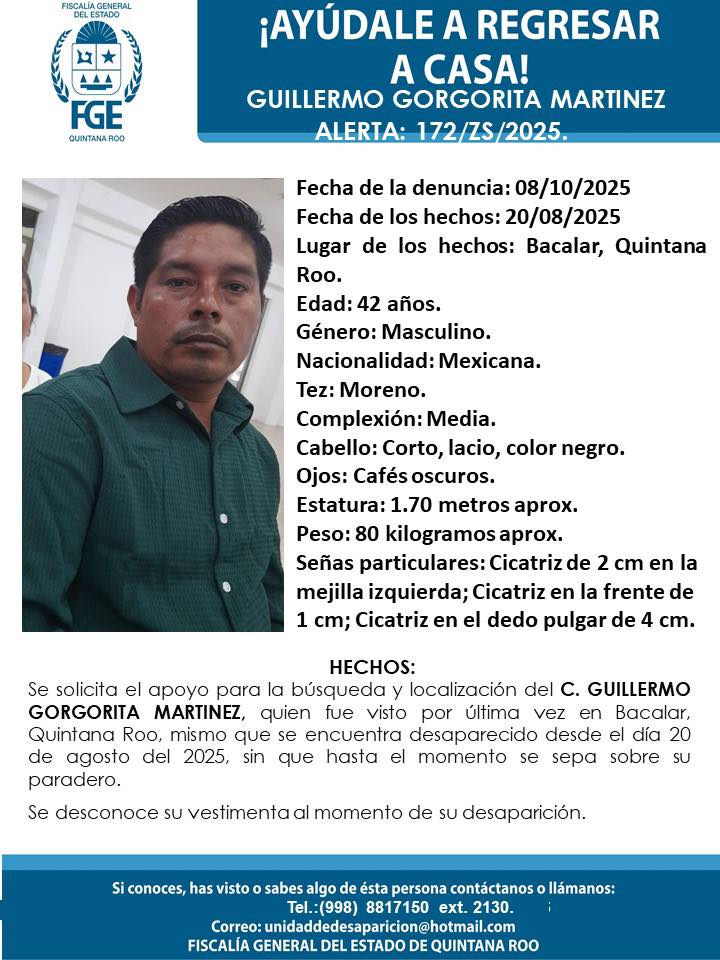 Chetumal, 11 de octubre.- La Fiscalía General del Estado de Quintana Roo emitió una ficha de búsqueda para dar con el paradero de Guillermo Gorgorita Martínez, de 42 años, reportado como desaparecido desde el 20 de agosto en el municipio de Bacalar. Las autoridades continúan recabando información que ayude a localizarlo con vida.