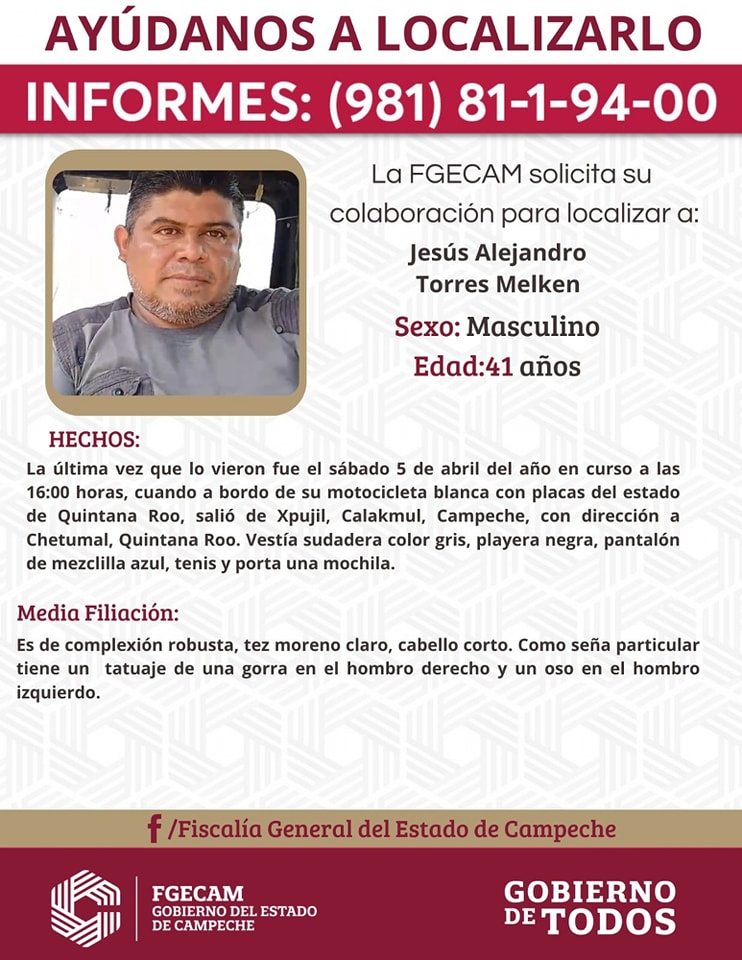 Jesús Alejandro Torres Melken desapareció el 5 de abril mientras viajaba en motocicleta de Xpujil a Chetumal. Autoridades de Campeche iniciaron una investigación y familiares solicitan apoyo ciudadano