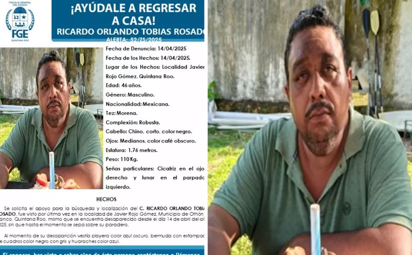 Chetumal, 17 de abril.- Las autoridades estatales investigan la desaparición de Ricardo Orlando Tobías Rosado, de 46 años, quien fue presuntamente privado de su libertad durante la madrugada del miércoles 16 de abril en la comunidad de Javier Rojo Gómez, ubicada en la ribera del río Hondo, dentro del municipio de Othón P. Blanco. La Fiscalía General del Estado activó los protocolos de búsqueda y ya emitió una ficha oficial con datos relevantes para su localización.