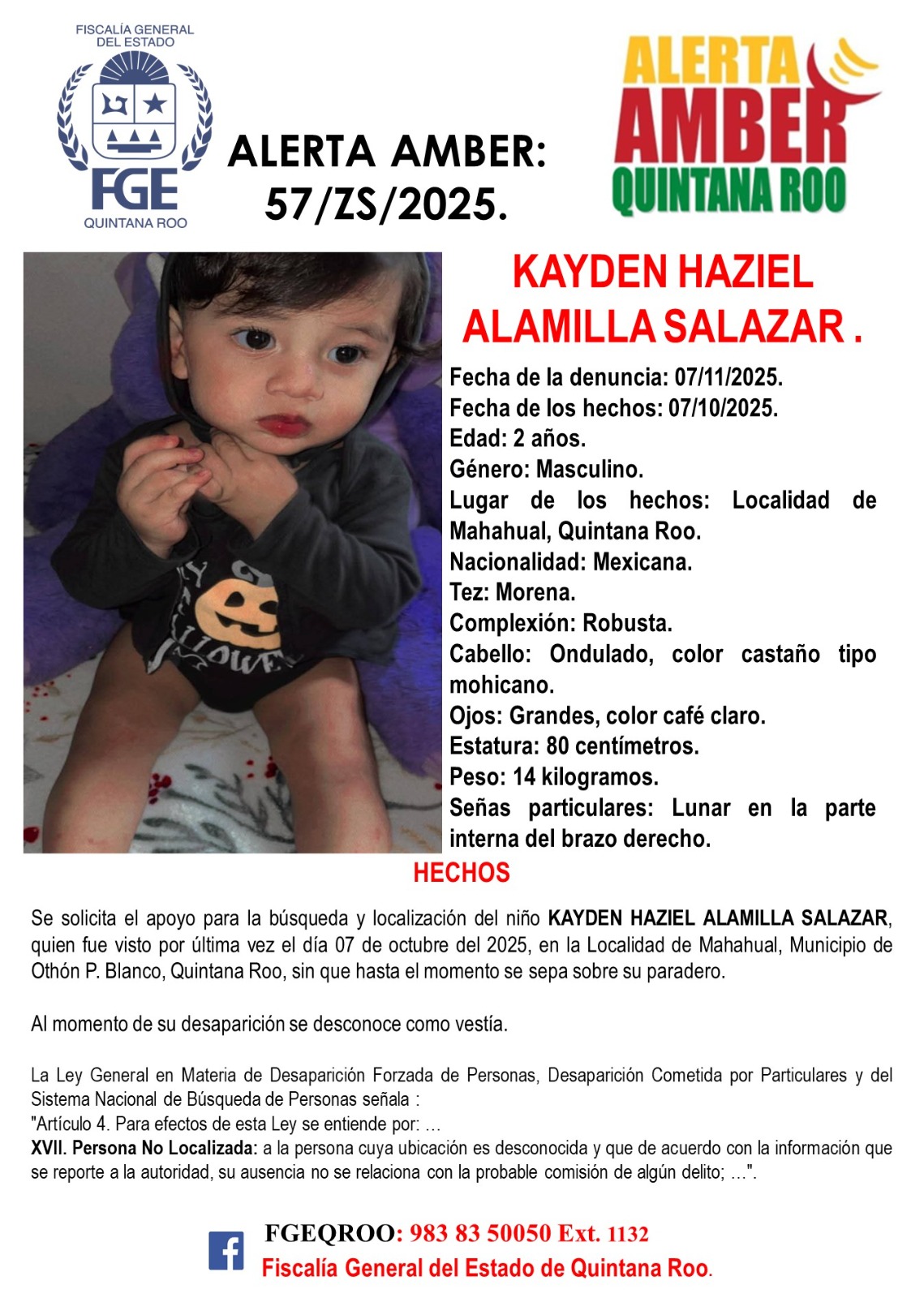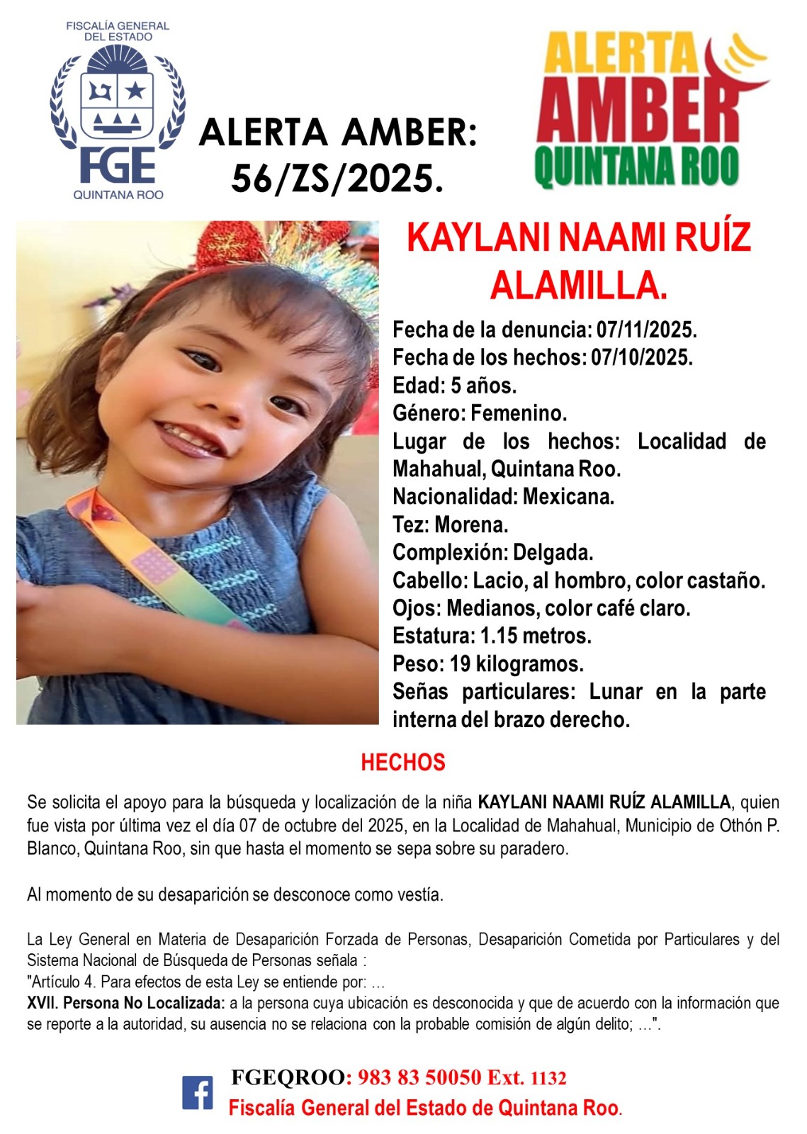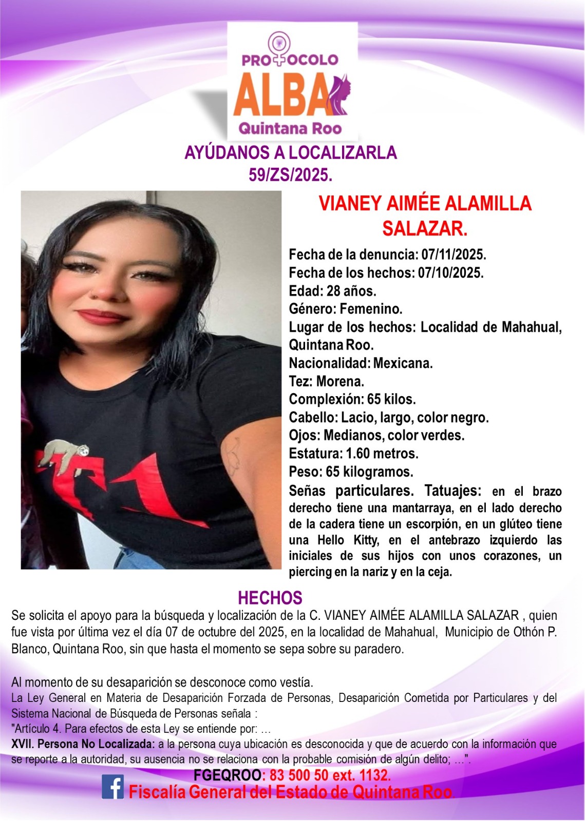La Fiscalía solicitó la colaboración de la ciudadanía para aportar cualquier dato que ayude a dar con su ubicación. Cualquier información puede ser proporcionada al número 983 83 5 00 50, extensión 1132, o directamente en las instalaciones de la FGE.