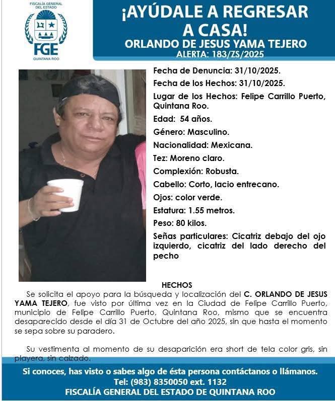 FELIPE CARRILLO PUERTO a 31 de octubre.— La Comisión de Búsqueda de Personas del Estado de Quintana Roo (CBPEQROO) emitió una alerta de búsqueda para localizar a Orlando de Jesús Yama Tejero, de 54 años de edad, quien fue visto por última vez este 31 de octubre de 2025 en la cabecera municipal de Felipe Carrillo Puerto. Desde entonces, se desconoce su paradero.