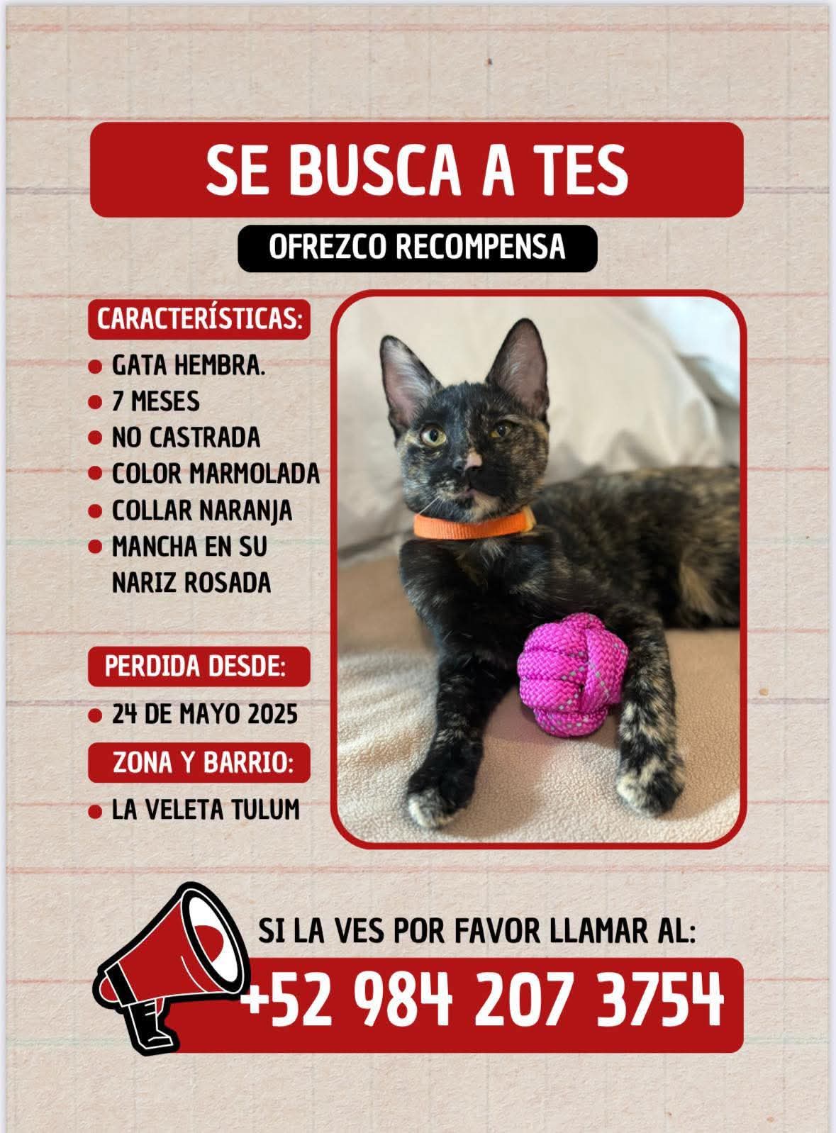 En caso de haber visto a la gatita o contar con información útil, se solicita comunicarse al número: +52 984 207 3754.