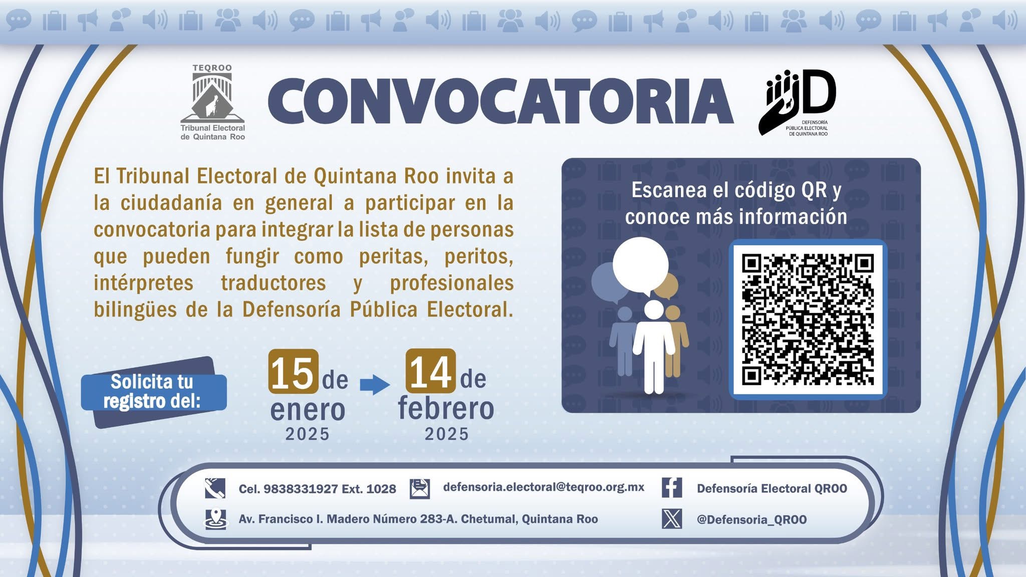 Cancún, Quintana Roo, 19 de enero 2025. – La Defensoría Pública Electoral del Tribunal Electoral de Quintana Roo (Teqroo) arrancó con la recepción de documentos de las personas interesadas en ser reconocidas dentro del listado de peritos, peritas e intérpretes, traductores en señas mexicanas y lengua maya.