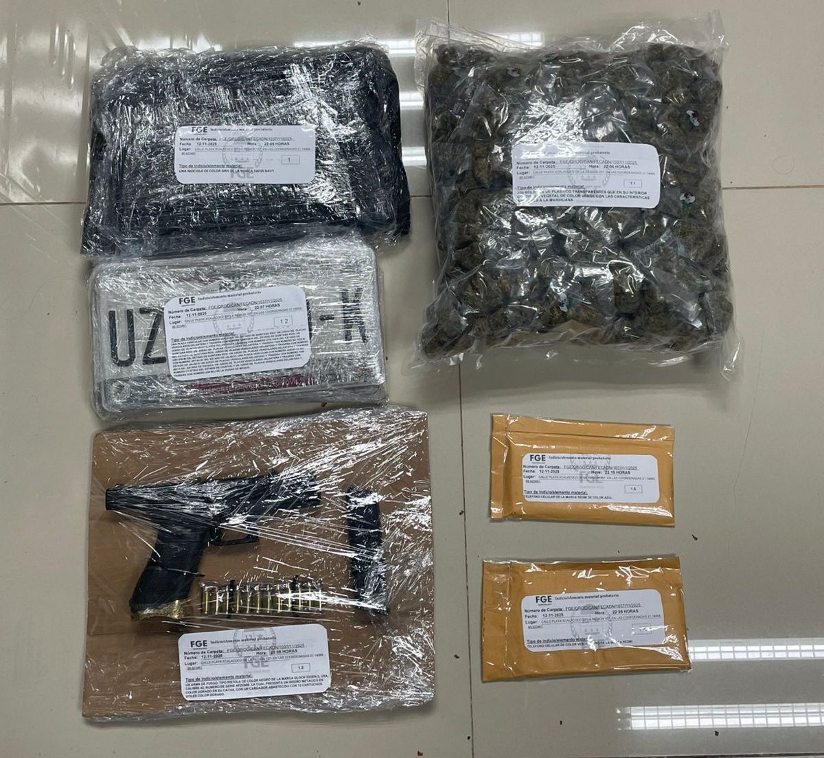 Al momento de su arresto, Ignacio Eduardo “N” tenía en su poder un arma de fuego corta calibre .40 con cargador abastecido y cartuchos útiles. También le fue asegurado vegetal verde con características de la marihuana, así como placas vehiculares de los estados de Quintana Roo, Jalisco, Oaxaca, Chiapas y Ciudad de México.