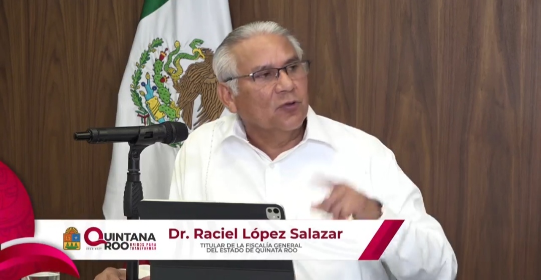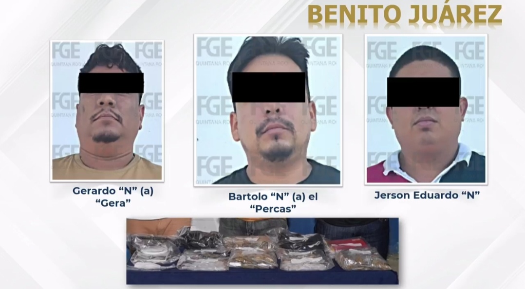 Cancún, 22 de septiembre.- El fiscal general del Estado, Raciel López Salazar, informó sobre la detención de tres presuntos miembros de un grupo delictivo, entre ellos Gerardo “N”, alias “El Gera”, un objetivo prioritario del Atlas Delictivo del Estado. Las autoridades lo identificaron como un líder de extorsiones y de invasiones de terrenos.