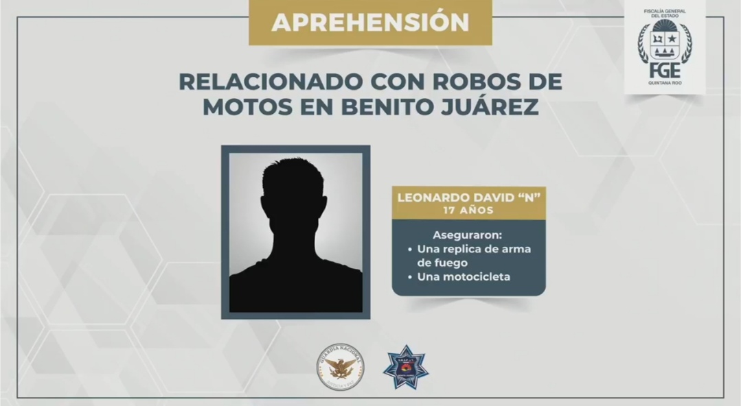 Cancún, 9 de febrero. – Un jovencito menor de edad identificado como Leonardo David, originario de Quintana Roo, fue detenido por elementos de la Policía de Investigación en un operativo conjunto con la Guardia Nacional y la Policía Municipal en la Supermanzana 216 de Benito Juárez. El menor es señalado por su probable participación en el delito de robo de vehículos con violencia, actividad que realizaba desde hace aproximadamente ocho meses en la ciudad.