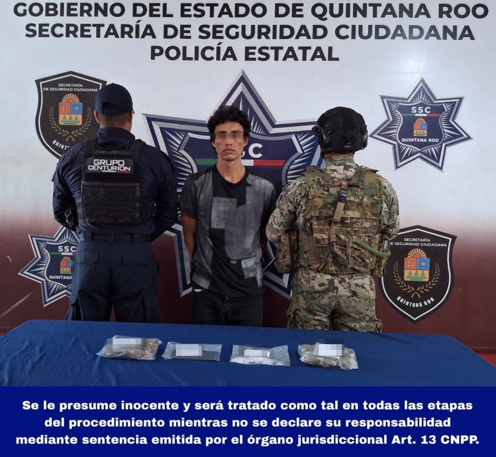 Cancún, 14 de octubre.- Elementos del Grupo Centurión de la Secretaría de Seguridad Ciudadana (SSC), en coordinación con personal de la Secretaría de Marina (SEMAR), detuvieron a José Yohany “N” por su probable participación en delitos contra la salud en el fraccionamiento Haciendas Real del Caribe.
