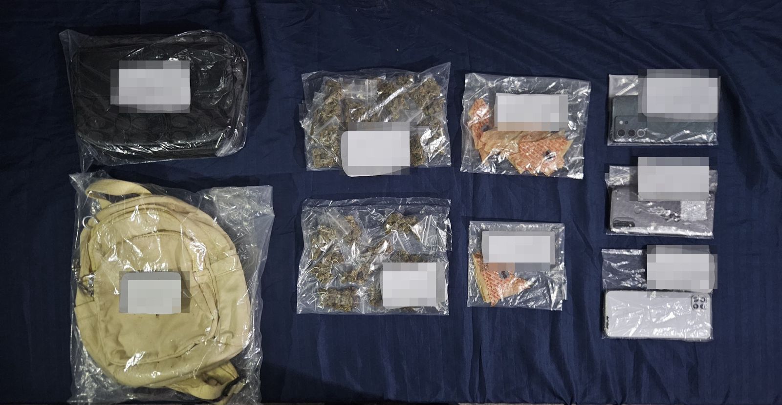 Durante la revisión, se les aseguraron una mariconera negra, una mochila beige, 30 bolsitas con vegetal verde presuntamente marihuana, así como 20 bolsitas triangulares con fragmentos sólidos similares al cristal.