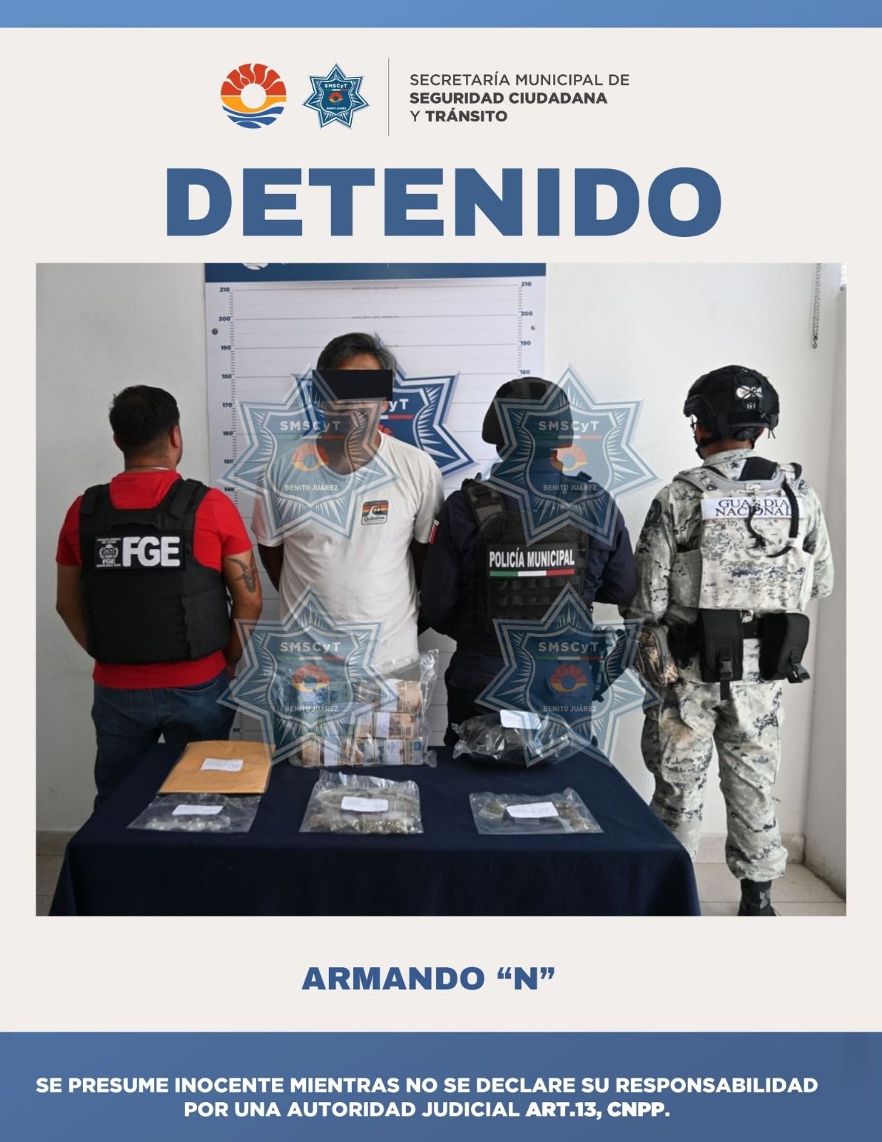 CANCÚN, QRoo., 25 de agosto de 2025.- Un nuevo golpe al narcomenudeo dejó al descubierto no solo una operación callejera de drogas, sino también una alarmante cantidad de dinero en efectivo circulando en manos del crimen. En un operativo conjunto, oficiales de la Guardia Nacional, la Fiscalía General del Estado y la Secretaría Municipal de Seguridad Ciudadana y Tránsito (SMSCyT) de Benito Juárez detuvieron a un hombre que operaba en plena vía pública, en la región 254.