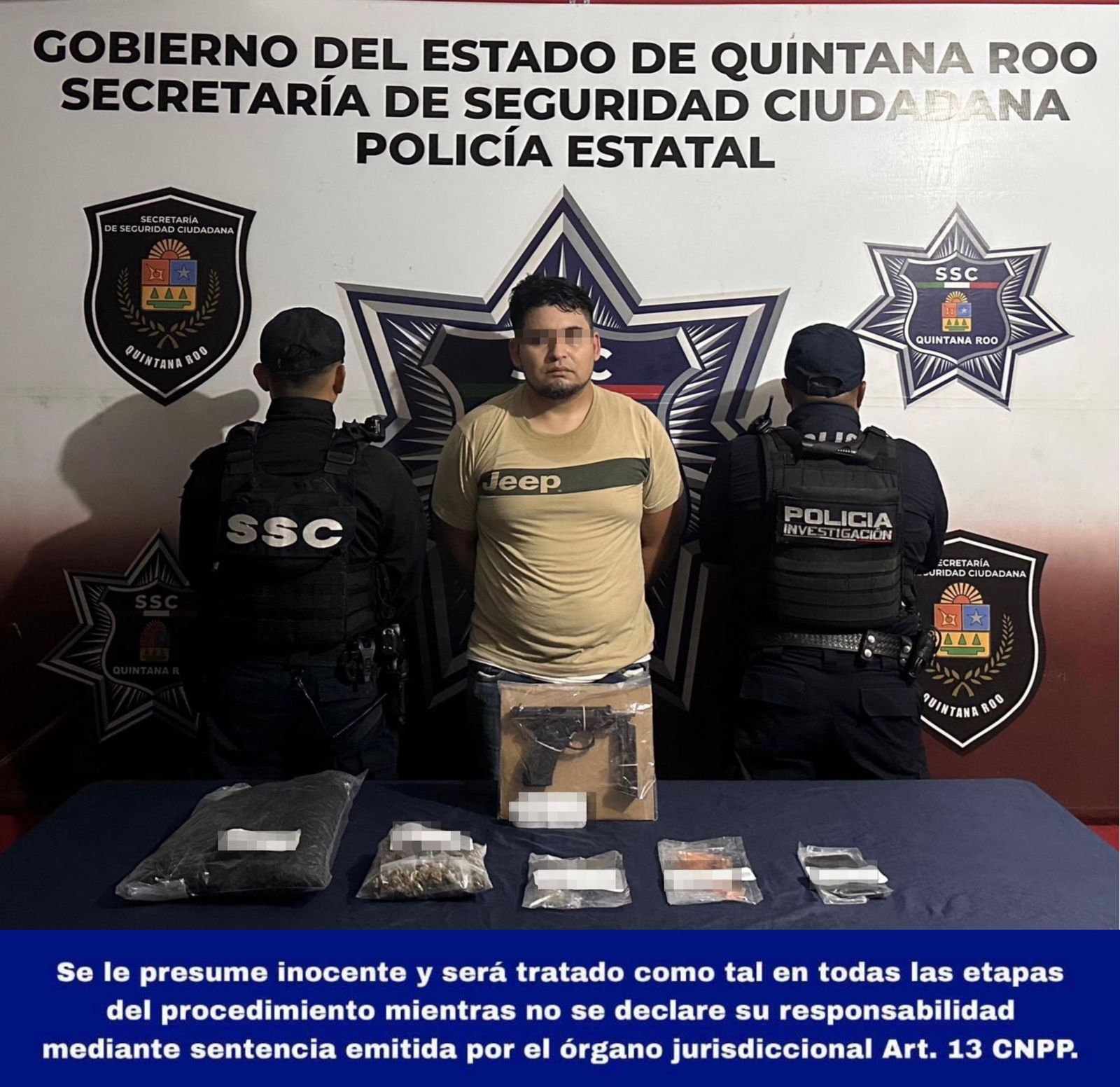 Cancún,16 de julio.– La Secretaría de Seguridad Ciudadana (SSC) detuvo a un taxista identificado como Benito “N”, quien fue sorprendido con una considerable cantidad de drogas y un arma de fuego. El arresto se realizó durante un recorrido de vigilancia de rutina en el fraccionamiento Ciudad Natura.
