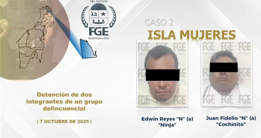 Isla Mujeres, 13 de octubre.- La Fiscalía General del Estado (FGE) asestó un nuevo golpe a la red de distribución de drogas en Isla Mujeres al capturar a dos individuos identificados como presuntos narcomenudistas en la zona Centro.