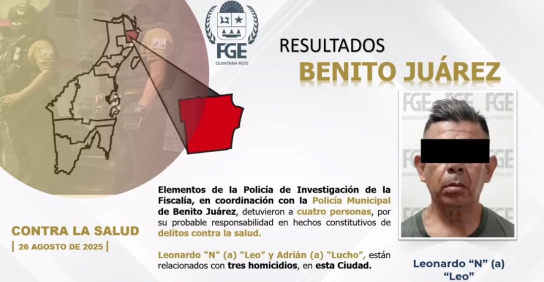 El fiscal Raciel López Salazar, reveló que entre los detenidos se encuentra Leonardo N, alias “El Leo”, identificado como líder del grupo criminal y propietario de un local de artesanías en el Mercado 28, el cual era utilizado como fachada para la venta de drogas. Junto a él fueron asegurados Carlos N, alias “Charly”, Adrián N, alias “Lucho”, y Luis Ángel N.