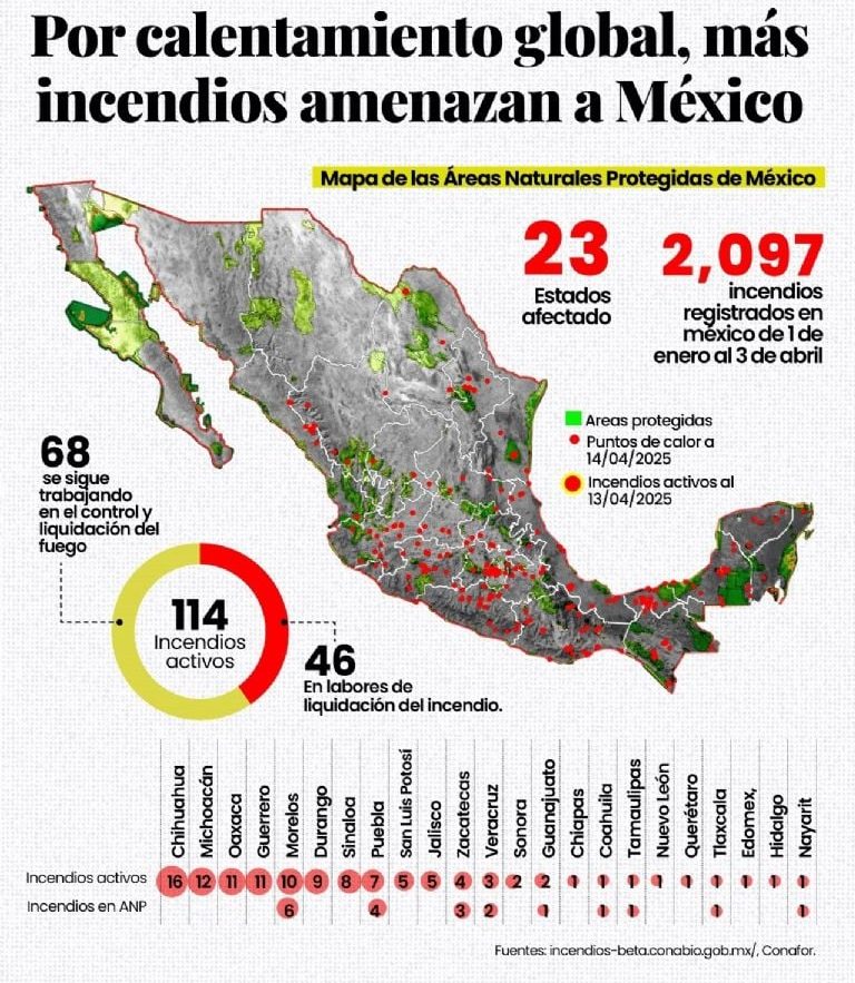 Tan solo este 9 de abril en el país había 54 incendios activos en 20 estados y 2 mil 333 combatientes desplegados.