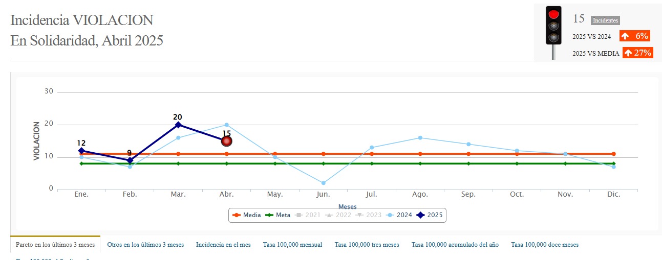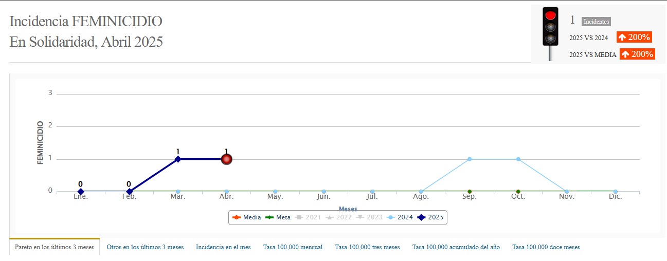 Feminicidios: A diferencia de 2024, que no registró casos en el primer cuatrimestre, este año se han lamentado dos decesos de mujeres a manos de hombres. Cabe destacar que Solidaridad cuenta con Alerta de Género desde 2017. Bárbara Delgado, titular del Instituto de la Mujer de Playa del Carmen, ha asegurado que se trabaja en una estrategia integral para atender las 24 recomendaciones de la Alerta de Violencia de Género contra las Mujeres (AVGM).