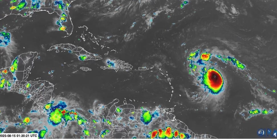 Se espera que el huracán Erin siga evitando un impacto directo en cualquier masa terrestre, pasando al norte de Puerto Rico y luego curvándose hacia el norte-noreste en el Atlántico abierto, entre la costa este de EE.UU. y Bermudas la próxima semana. Durante este trayecto, se prevé que duplique o incluso triplique su tamaño.