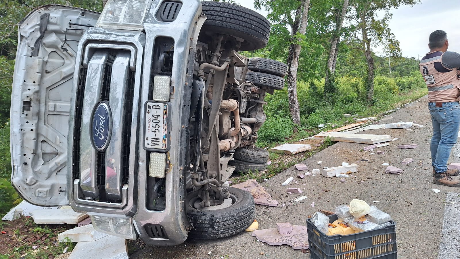 FELIPE CARRILLO PUERTO a 23 de enero.-  Un camión cargado de productos lácteos terminó volcado a escasos 9 kilómetros de llegar a esta cabecera municipal, luego de que el conductor realizara una maniobra evasiva para evitar un choque frontal con otro vehículo que invadió su carril. El accidente ocurrió la mañana de este jueves sobre la carretera federal 307, en el tramo Uh May – Felipe Carrillo Puerto, específicamente en el kilómetro 124+000.
