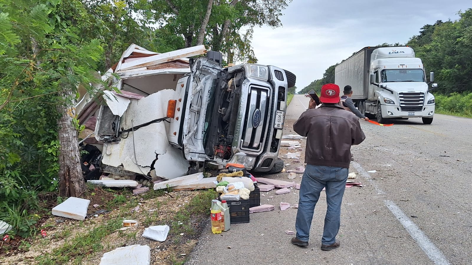 FELIPE CARRILLO PUERTO a 23 de enero.-  Un camión cargado de productos lácteos terminó volcado a escasos 9 kilómetros de llegar a esta cabecera municipal, luego de que el conductor realizara una maniobra evasiva para evitar un choque frontal con otro vehículo que invadió su carril. El accidente ocurrió la mañana de este jueves sobre la carretera federal 307, en el tramo Uh May – Felipe Carrillo Puerto, específicamente en el kilómetro 124+000.