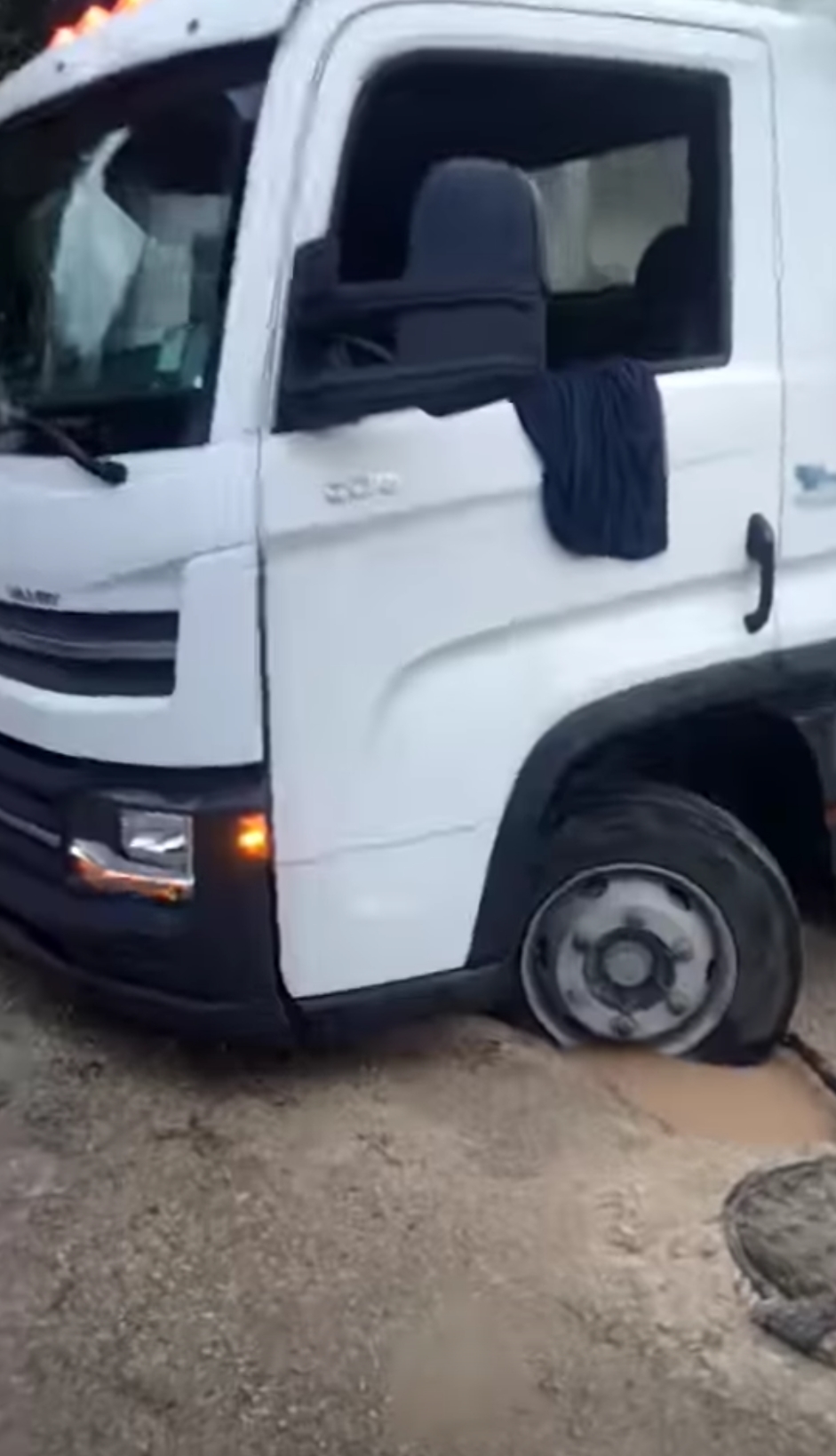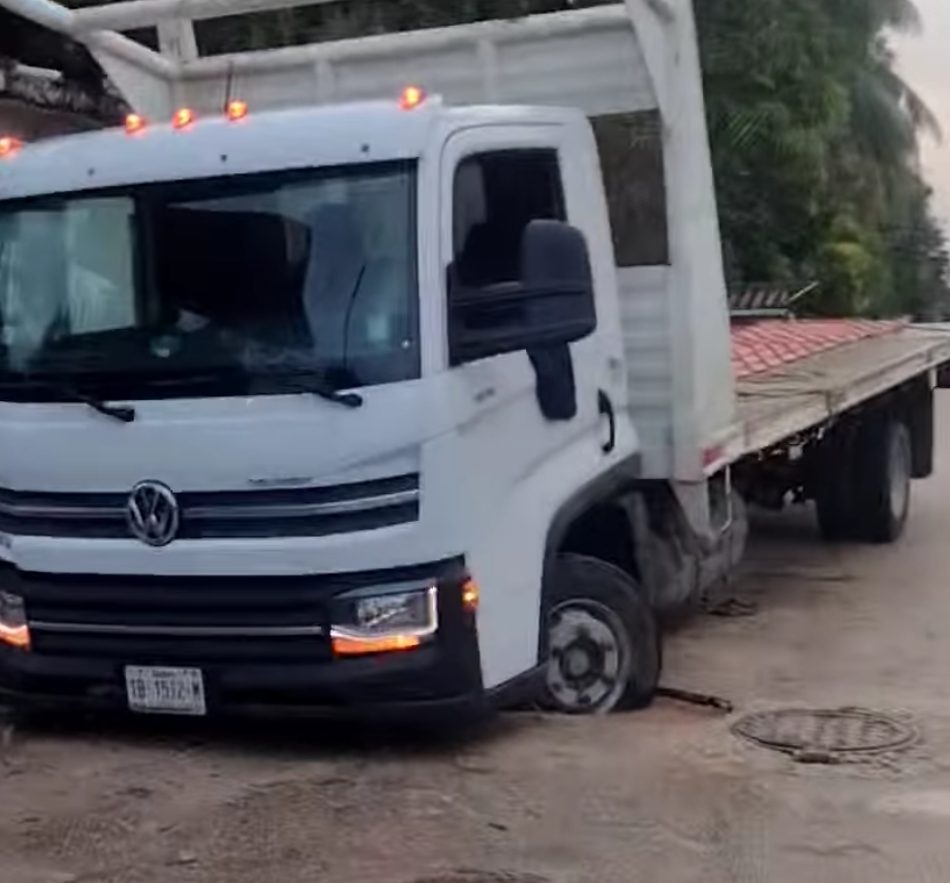 En esta ocasión, un camión quedó atascado en una zanja de aguas negras en la calle 11, entre las calles 22 y 24, de la colonia Gonzalo Guerrero, y tuvo que ser auxiliado por maquinaria pesada para salir.