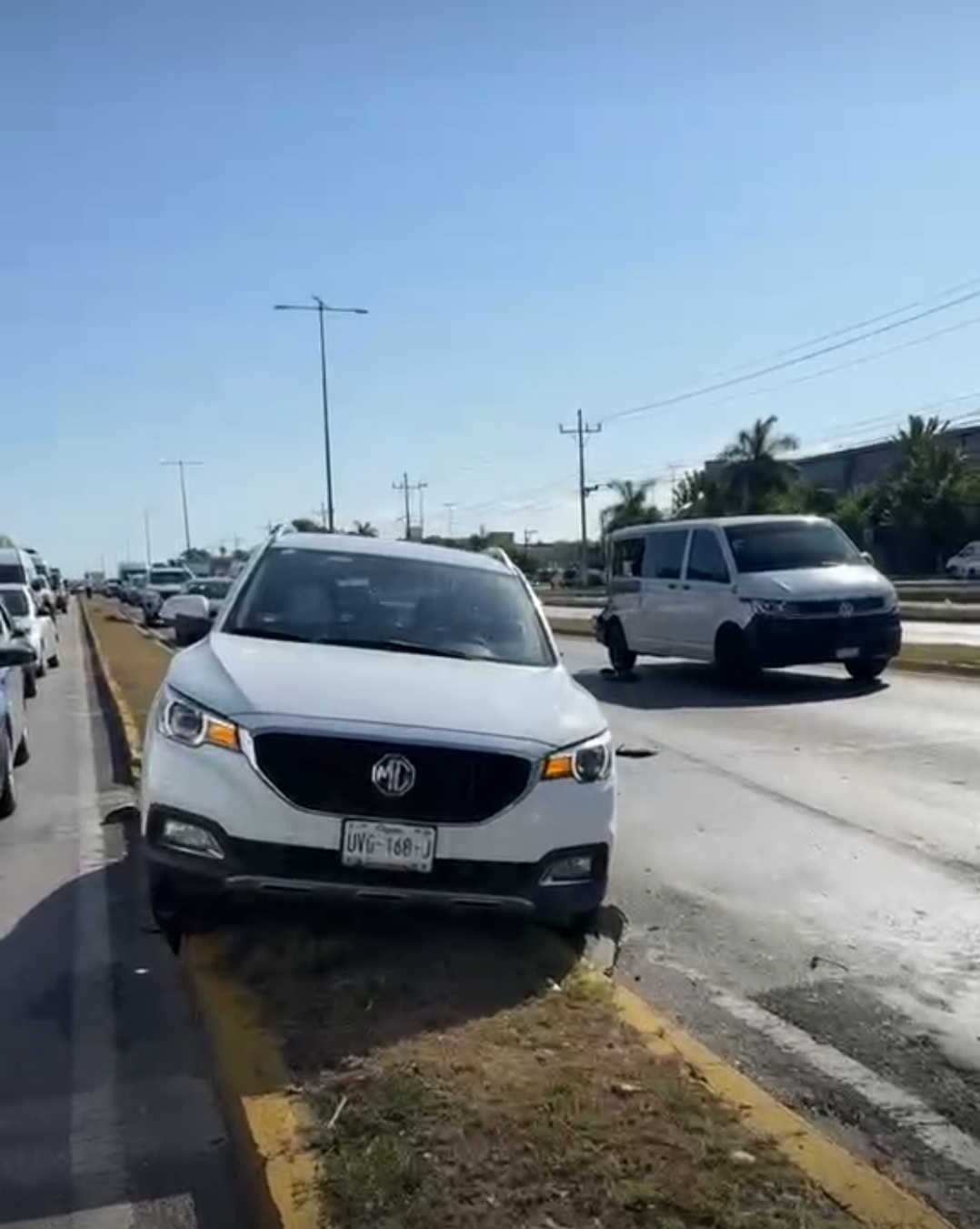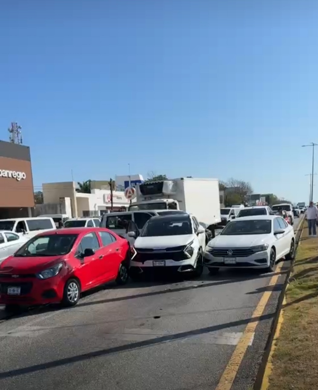 La mañana de este viernes, un aparatoso accidente paralizó la circulación del carril central del Boulevard Playa del Carmen al sur de la ciudad, a metros de la conocida plaza Centro Maya, luego de que un camión de carga presuntamente sufriera una falla en los frenos y desatara una carambola que involucró al menos a ocho vehículos.