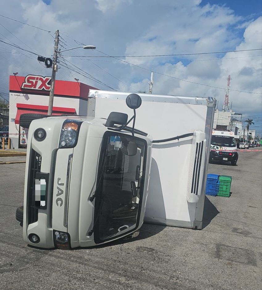 CANCÚN, 27 de enero. – Un aparatoso accidente se registró la tarde de este lunes en el cruce de las avenidas Chichén Itzá y Palenque, en la Supermanzana 61 de Cancún, dejando como saldo personas lesionadas y un camión volcado.