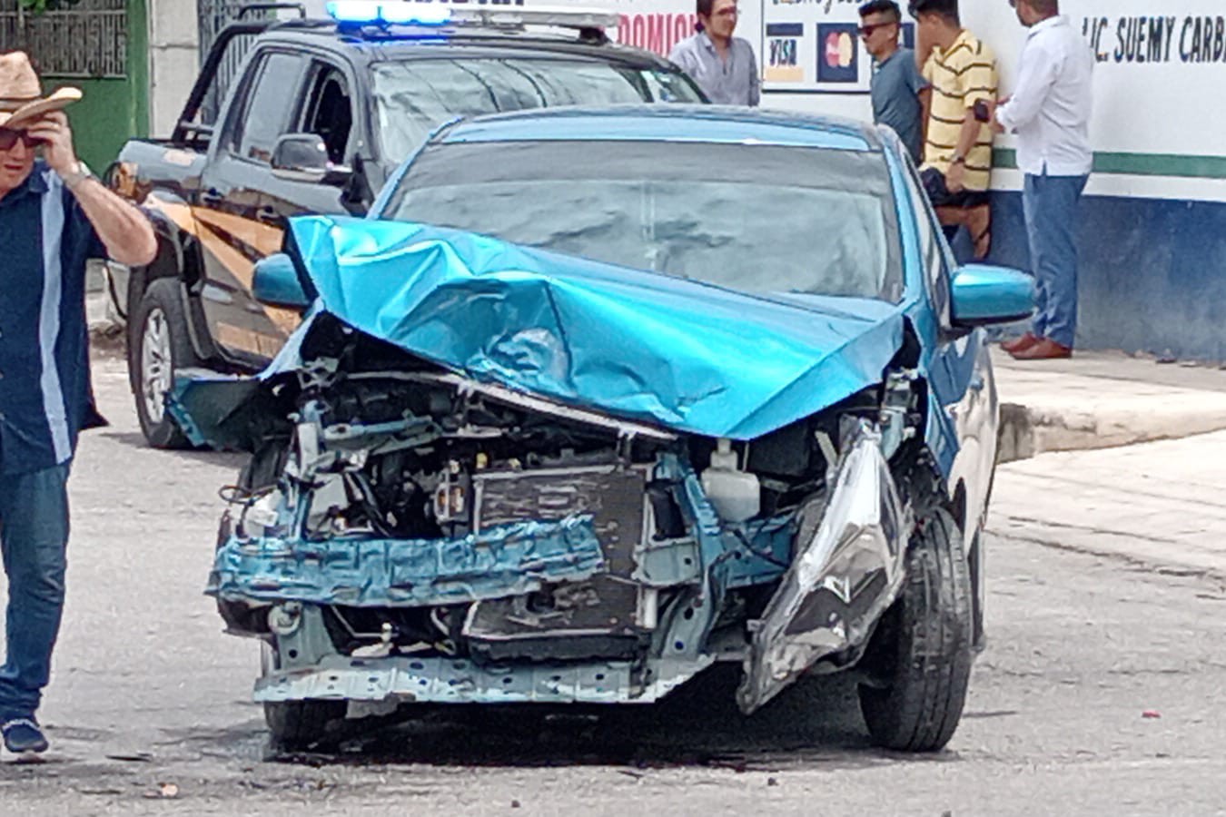 El Mirage era conducido sobre la 52, y llegando a la 115 la persona al volante no vio la señal de alto, se metió a la preferencia y lo embistió la camioneta, que funcionó como abrelatas porque se quedó en su guardalodos delantero un pedazo del auto compacto.