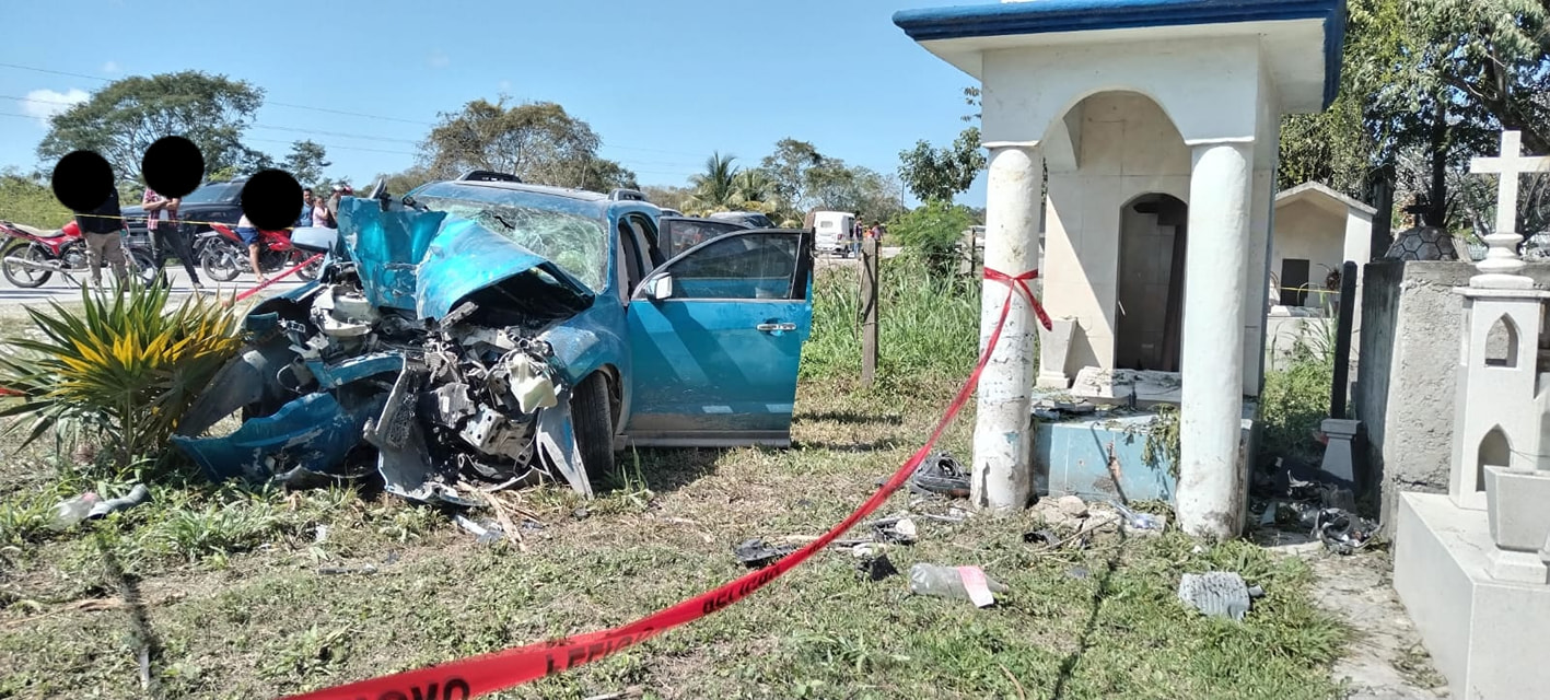 ► Una camioneta Captiva azul salió de la carretera y se estrelló contra una tumba en un panteón cercano, dejando un saldo de dos personas fallecidas y dos mujeres gravemente heridas en el municipio de Othón P. Blanco