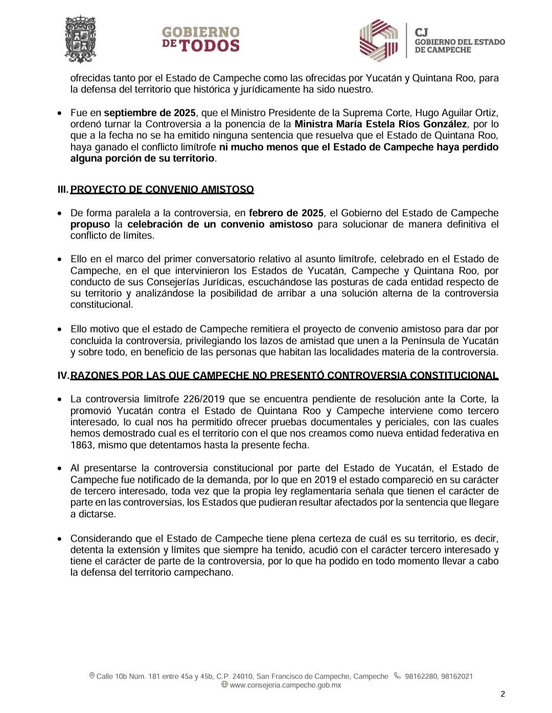 El Gobierno de Campeche afirmó que en septiembre de 2025, el ministro presidente de la Suprema Corte de Justicia de la Nación, Hugo Aguilar Ortiz, ordenó turnar la Controversia a la ponencia.