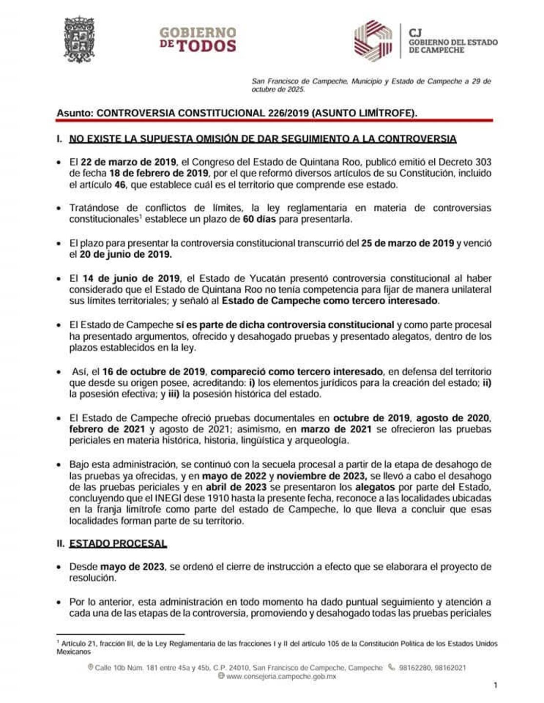 El Gobierno de Campeche afirmó que en septiembre de 2025, el ministro presidente de la Suprema Corte de Justicia de la Nación, Hugo Aguilar Ortiz, ordenó turnar la Controversia a la ponencia.
