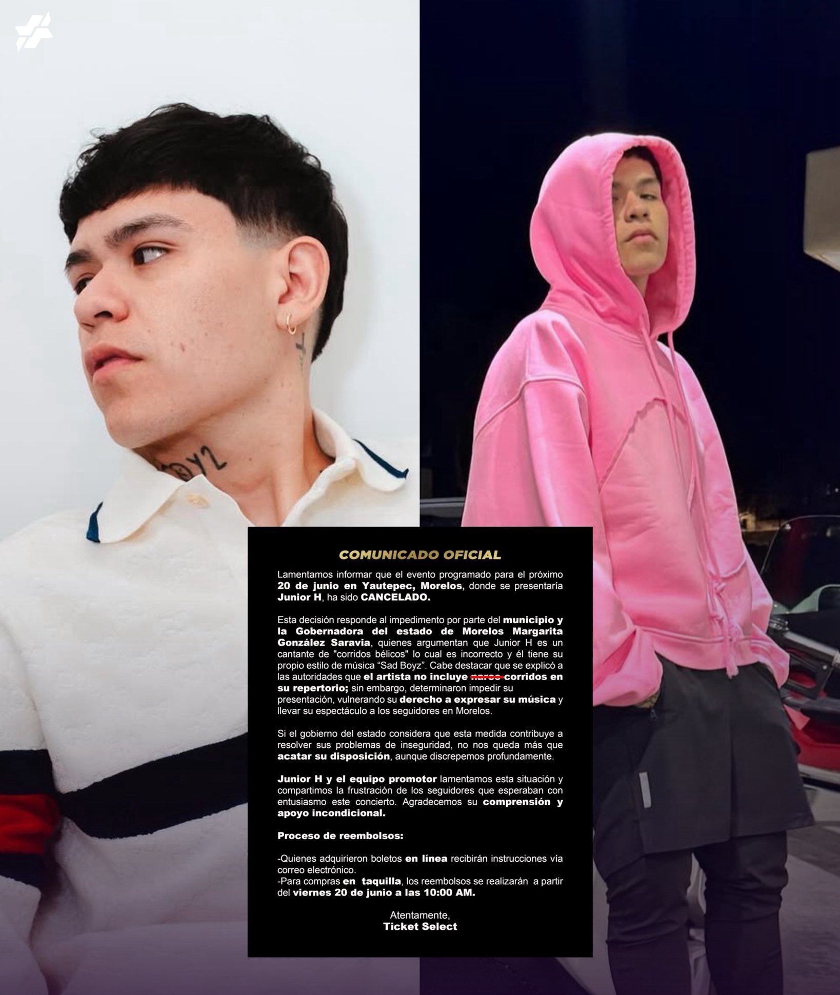 El concierto de Junior H que se llevaría a cabo el 20 de junio en Yautepec, Morelos, ha sido cancelado. Según un comunicado del artista, fue decisión del gobierno de Margarita Gonzáles Saravia por supuestamente ser un cantante de “corridos bélicos”.